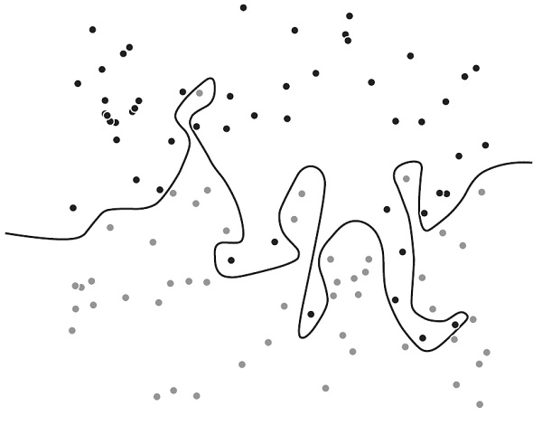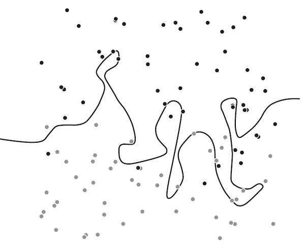Граница, показанная выше, — наша модель — отлично справляется и корректно отделяет данные из обучающего набора. Каждая точка выше границы — темная, а каждая ниже — светлая. Однако когда мы добавили еще сотню точек (на рисунке ниже), у нас одиннадцать темных оказались ниже границы, а девять светлых точек — выше нее. Вышло так, что наша линия, которую мы выбрали на основе обучающего набора, вилась и кружилась между темными и светлыми точками и приняла случайный мусор в данных за значимую закономерность. Наша модель переобучилась.