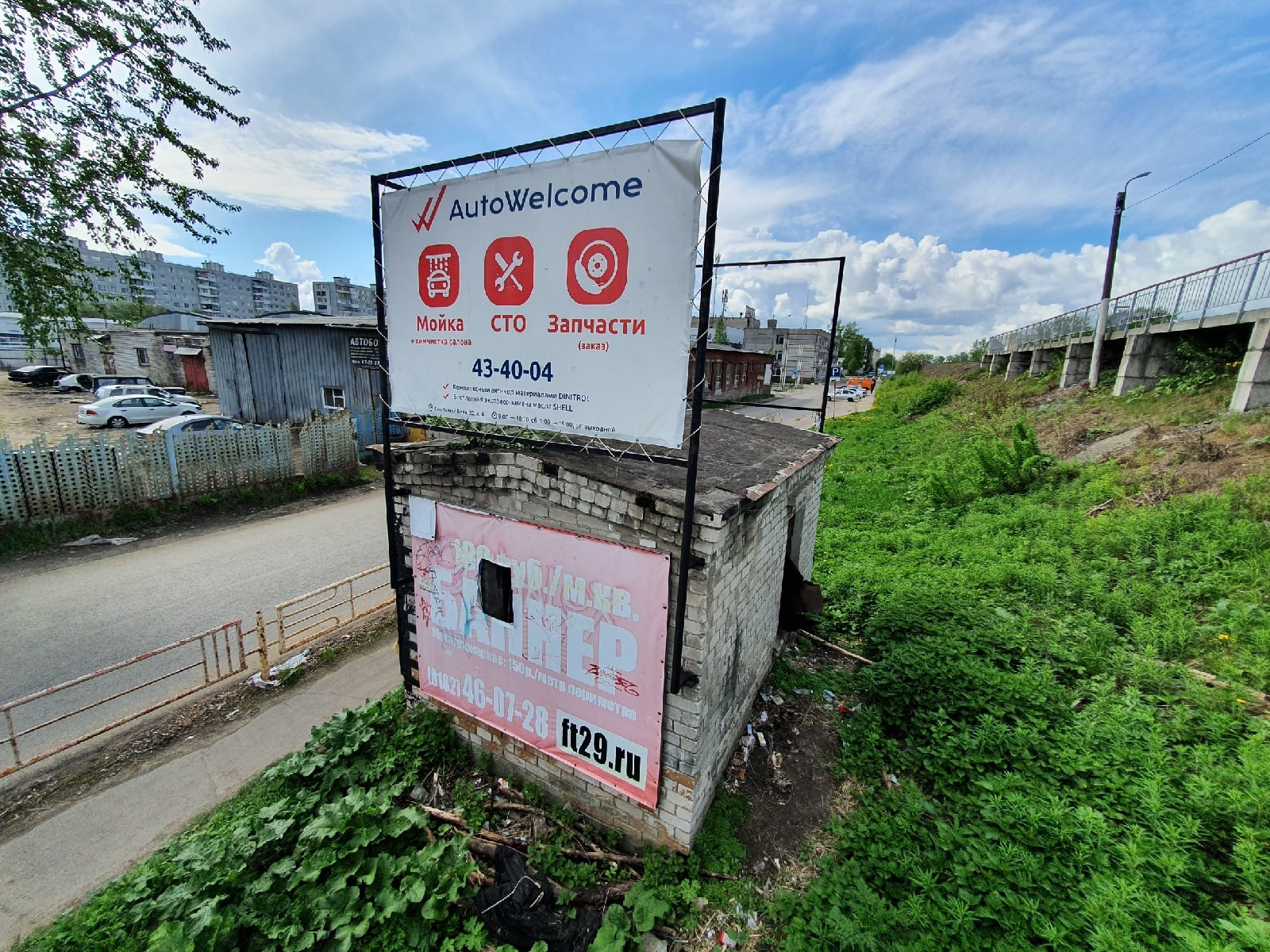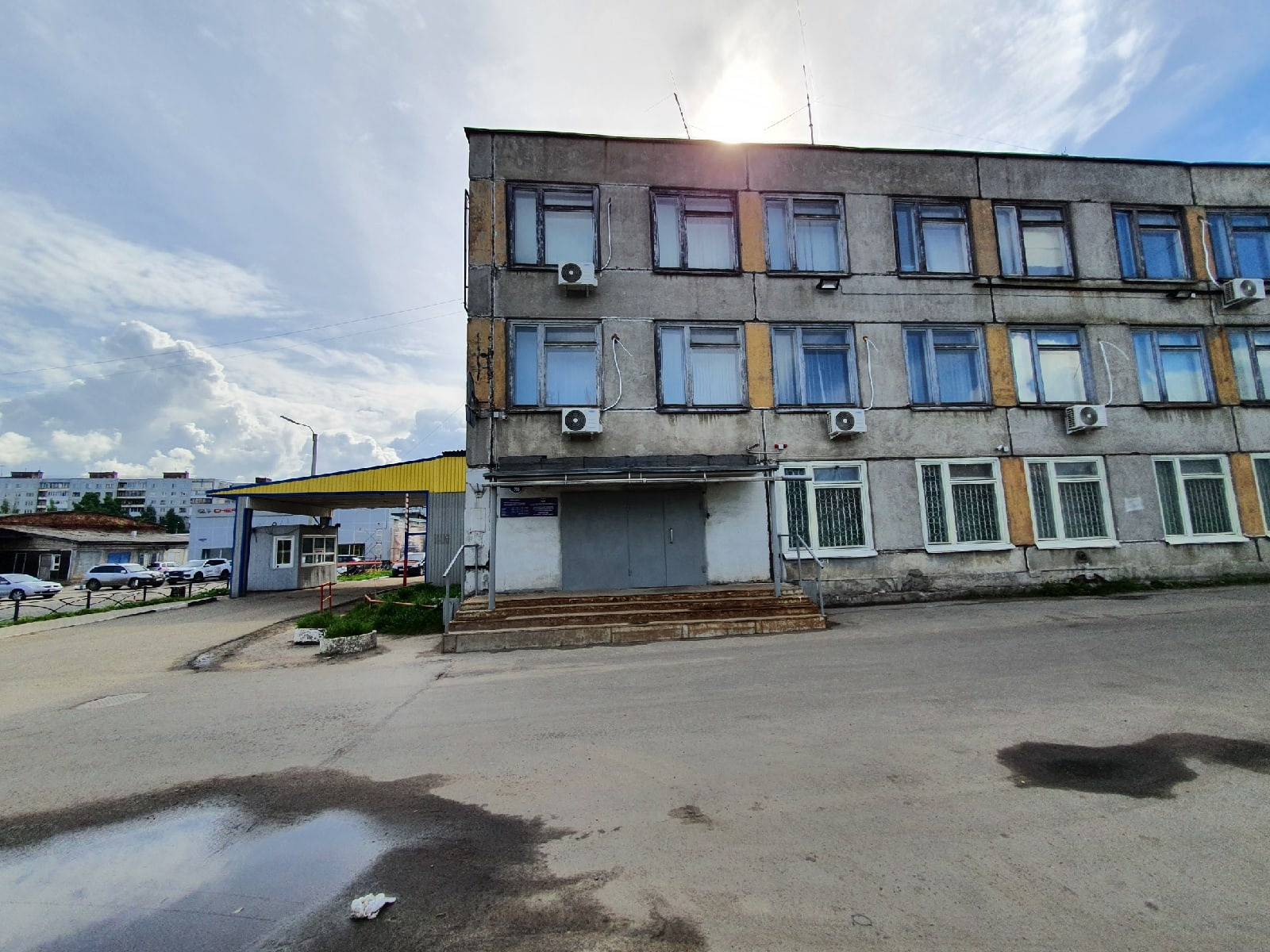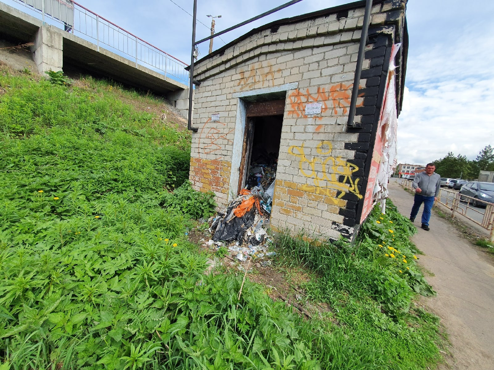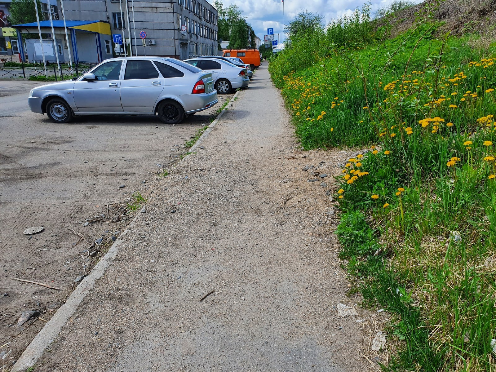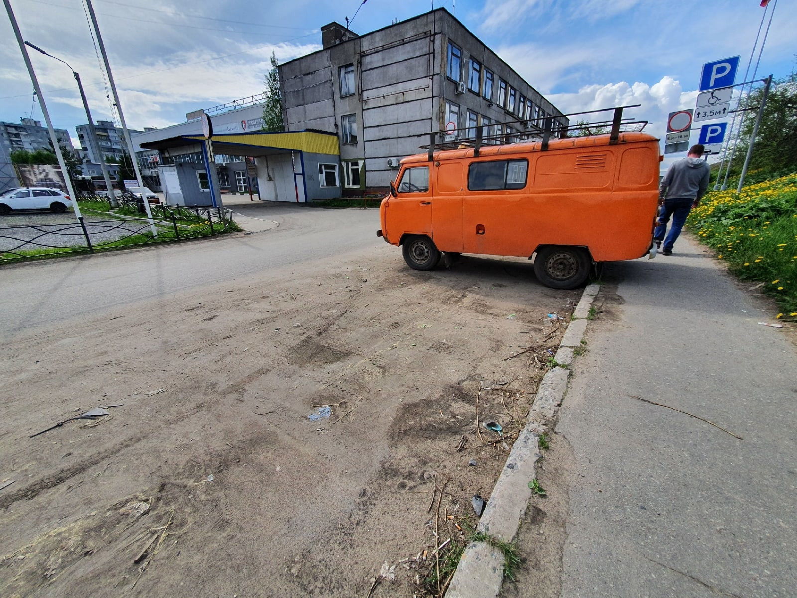 Самый грязный участок на Смольном Буяне - это в районе ГАИ, тут кучи песка на тротуаре у бордюра, на парковке. Непонятная будка с незаконной рекламой и мусор внутри и снаружи. Непонятно каким образом оказался выход из здания прямо на проезжую часть.