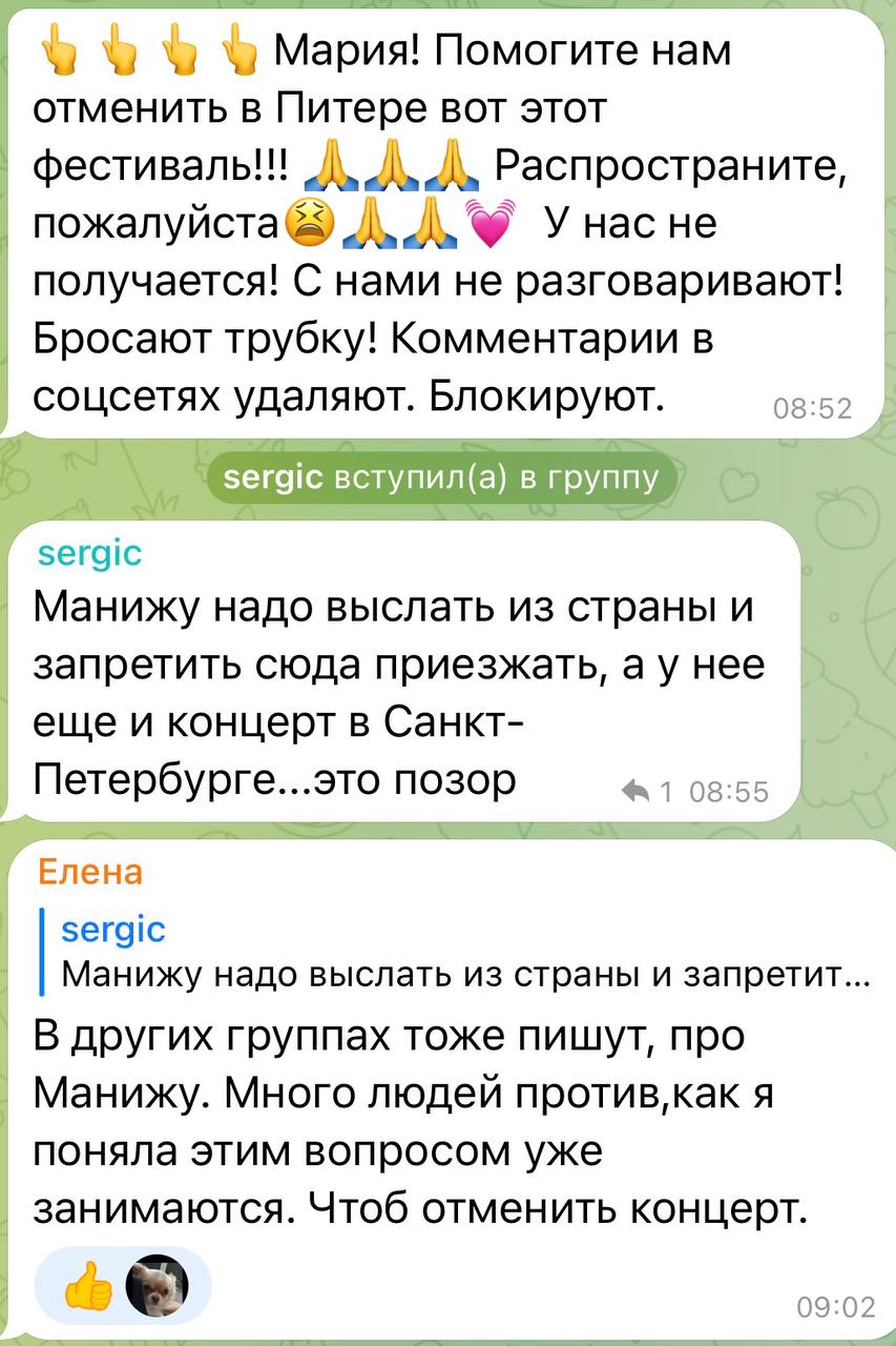 К примеру, в телеграм-канале «Осколок», где пишут о «расологии» и «возрождении России», есть инструкция, как сорвать выступление певицы. Для этого его авторы советуют написать заявление на сайте МВД России в такой форме: «Я, Иванов Иван Иванович, прошу вас привлечь российскую певицу Манижу Далеровну Сангин по статье 280.3 УК РФ, совершившую публичные действия, направленные на дискредитацию ВС РФ».
