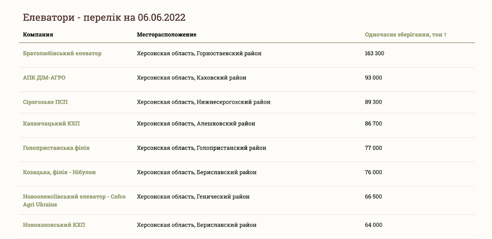 Элеваторы в Донецкой и Херсонской областях тоже немаленькие. Портал tripoli.land.ua ведет статистику украинских элеваторов. По их данным на 6 июня 2022, в Херсонской области, за которую в данный момент идут бои, элеваторы хранят 1 554 600 тонн зерна. Вот топ 8 из них: