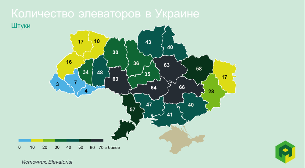 На оккупированных территориях до сих пор идут бои, поэтому подсчитать точное число захваченных элеваторов невозможно, но мы можем открыть довоенную карту элеваторов и убедиться, что в южных регионах Украины хранилищ с зерном не меньше, чем в западных.