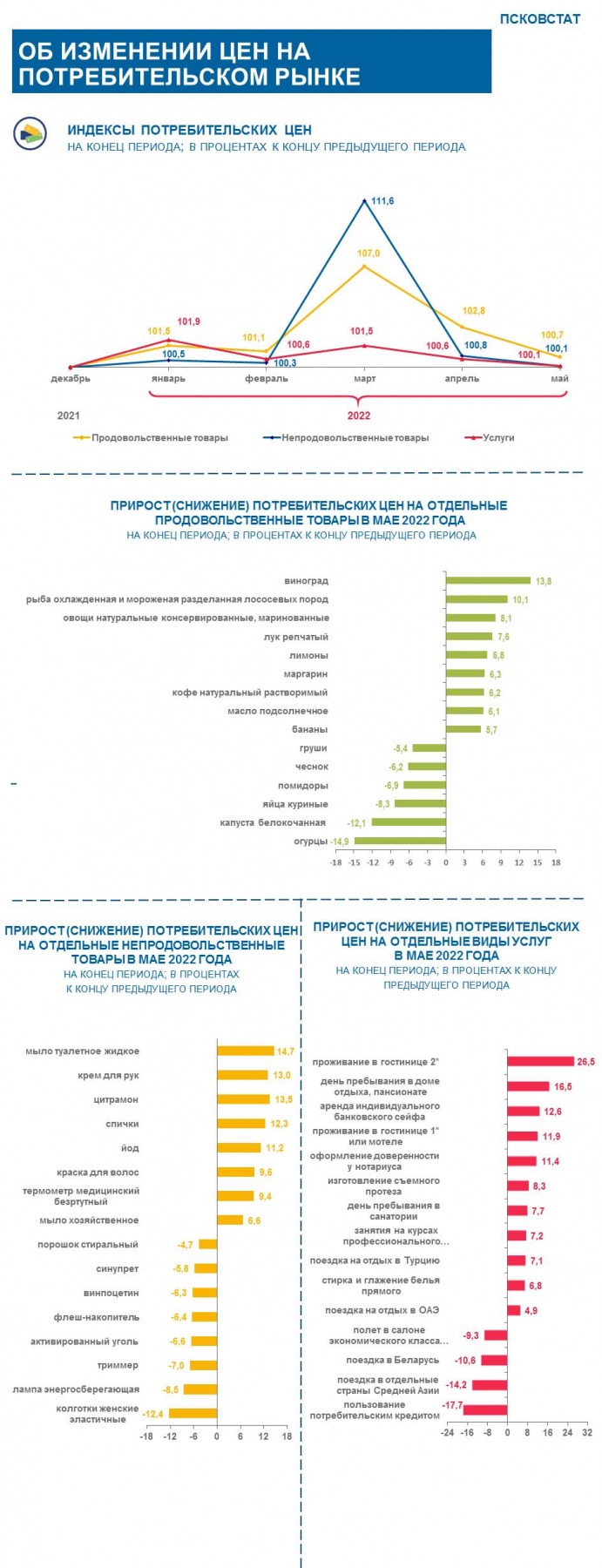 За май 2022 года индекс потребительских цен по Псковской области составил 100,4 процента: как сообщает Псковстат, темпы роста потребительских цен по сравнению с предыдущим месяцем замедлились (в апреле индекс потребительских цен составил 101,6 процента).