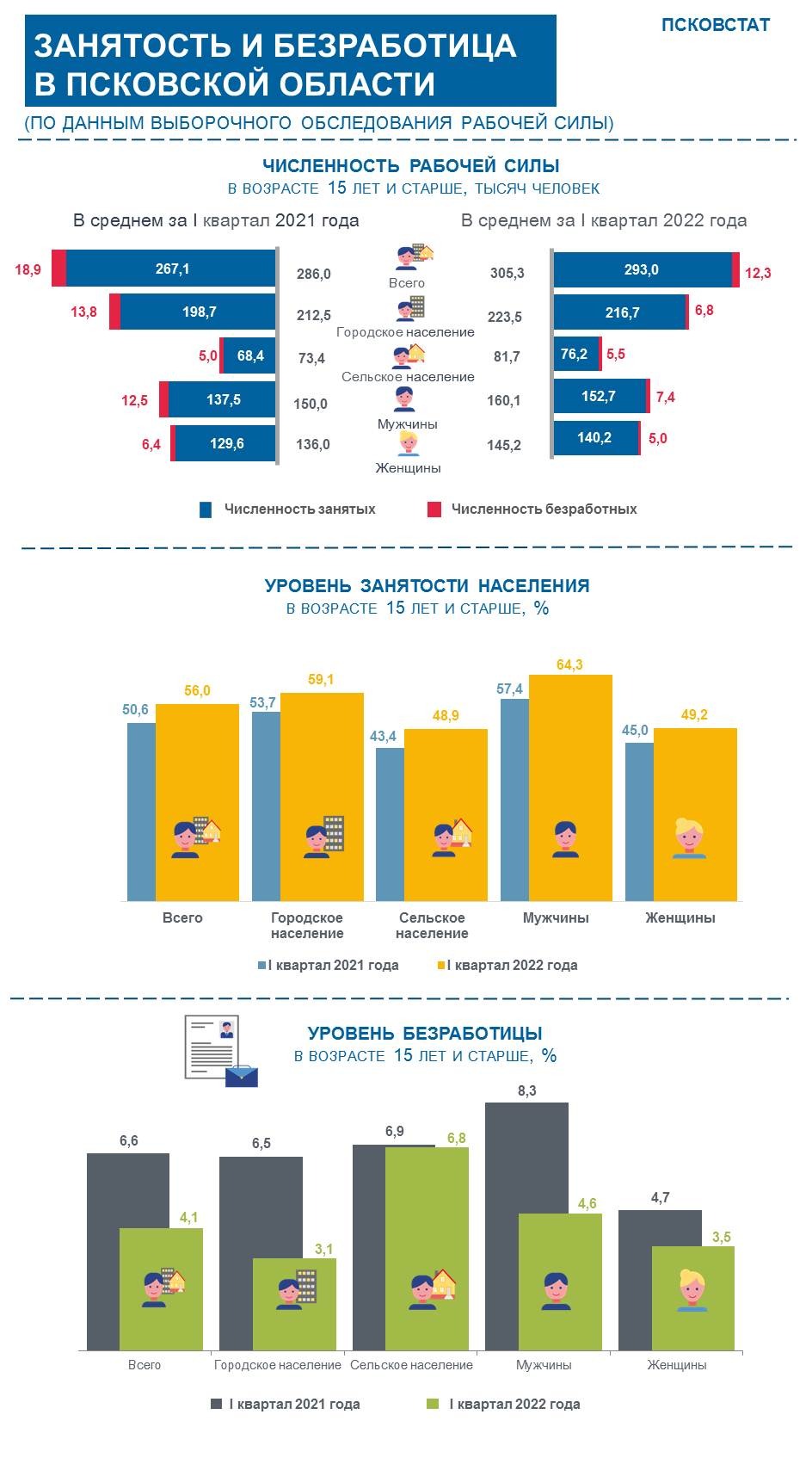 По итогам выборочных обследований населения численность рабочей силы (занятые и безработные) в возрасте 15 лет и старше в Псковской области в первом квартале 2022 года составила 305,3 тысячи человек или 58,4 процента от общей численности населения области в возрасте от 15 лет и старше. В их числе 293 тысячи человек классифицировались как занятые экономической деятельностью и 12,3 тысячи человек не имели работы или доходного занятия, искали работу и были готовы приступить к ней в обследуемую неделю, то есть считались безработными.