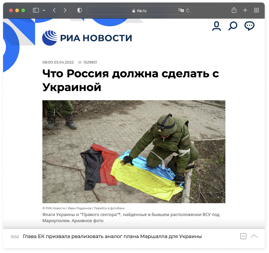 Десять лет спустя на сайте государственного агентства РИА «Новости» появилась статья Сергейцева «Что Россия должна сделать с Украиной». В этом тексте он изложил программу «денацификации» и «деукраинизации» Украины после ее поражения в войне с Россией. По всей видимости, задачей статьи было наполнить реальным содержанием расплывчатые описания целей «военной спецоперации», которые обозначил Владимир Путин в речи 24 февраля 2022 года.