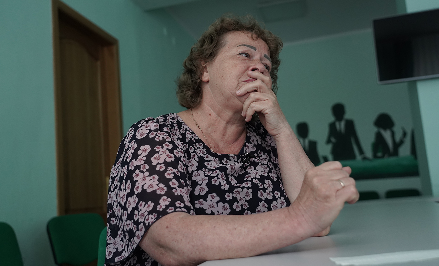 Одно из мест, куда распределяют переселенцев — лицей. На входе стоит Анна Латышина, она смогла вывезти из Херсонской области свою многочисленную семью — 12 человек: родители, дети, внучка, невестка. Они выехали почти сразу после начала вторжения.