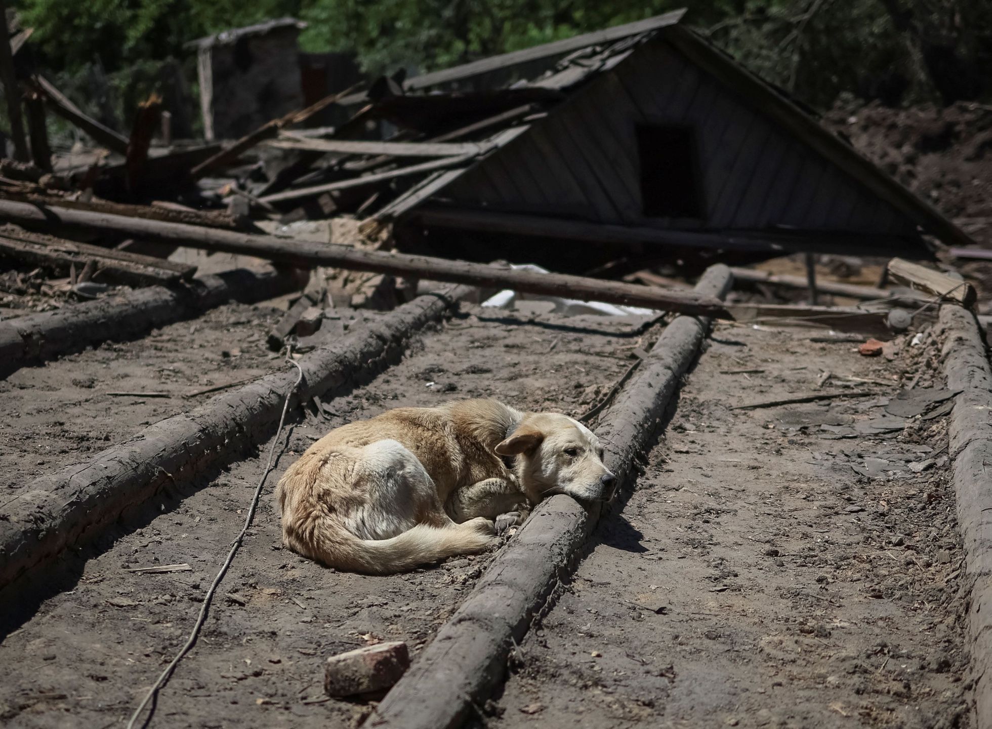 Константиновка, находящаяся в зоне боев, 9 июня в очередной раз подверглась обстрелу — один мирный житель погиб, еще один получил ранения. Разрушены несколько домов, в том числе тот, где жил этот пес и его хозяева.