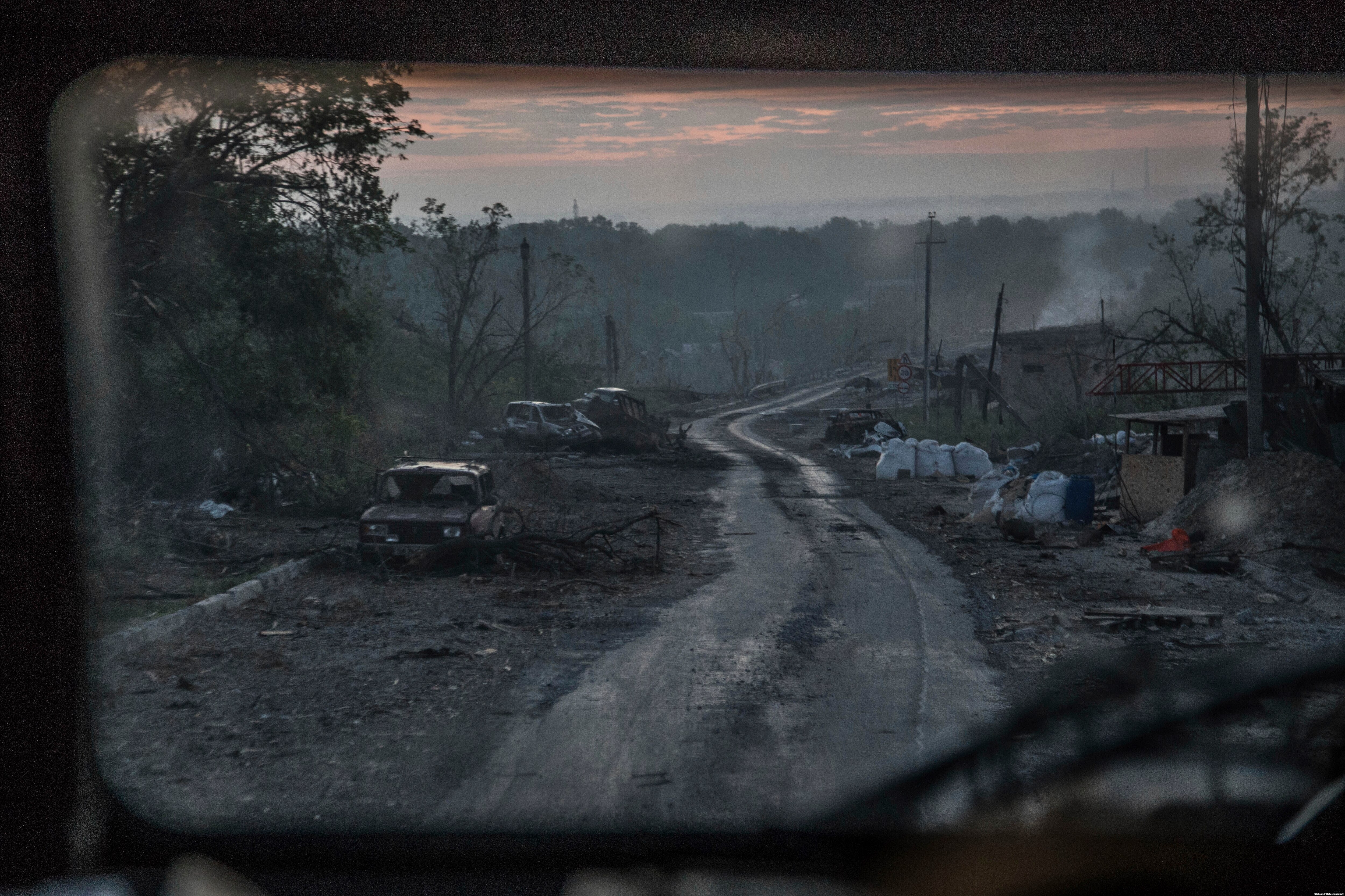 Уничтоженные автомобили вдоль дороги в городе Северодонецк Луганской области. Украина, 8 июня 2022 года