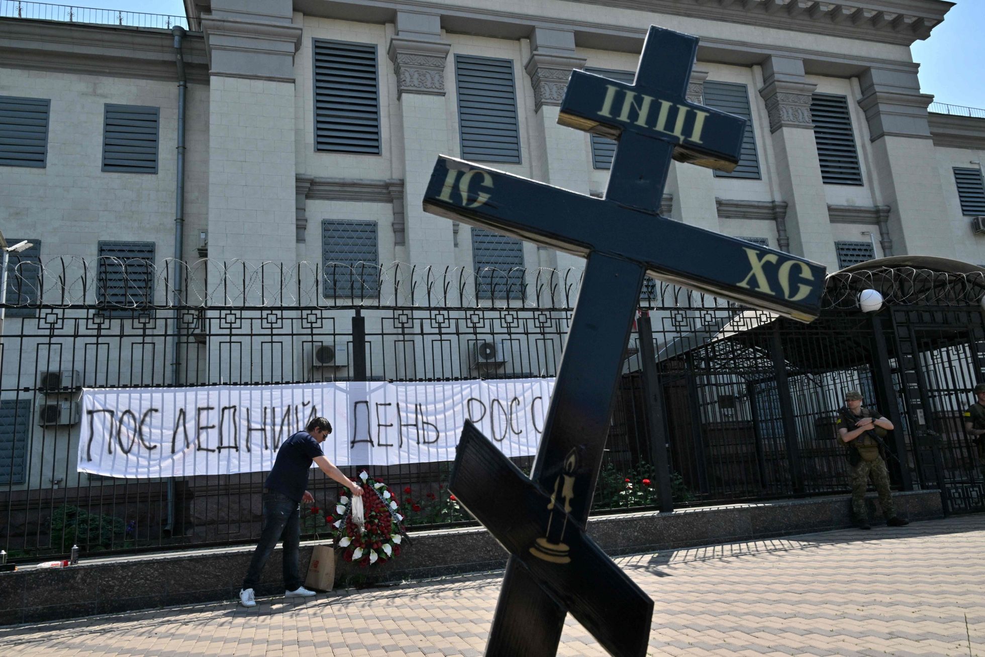 У здания российского посольства в Киеве прошла акция «Последний день России». Активисты возложили к забору венок, а на православные кресты прикрепили таблички «Российский оккупант». Кроме того, один из пришедших на акцию сжег свой российский паспорт. По его словам, он почти год живет в Украине.