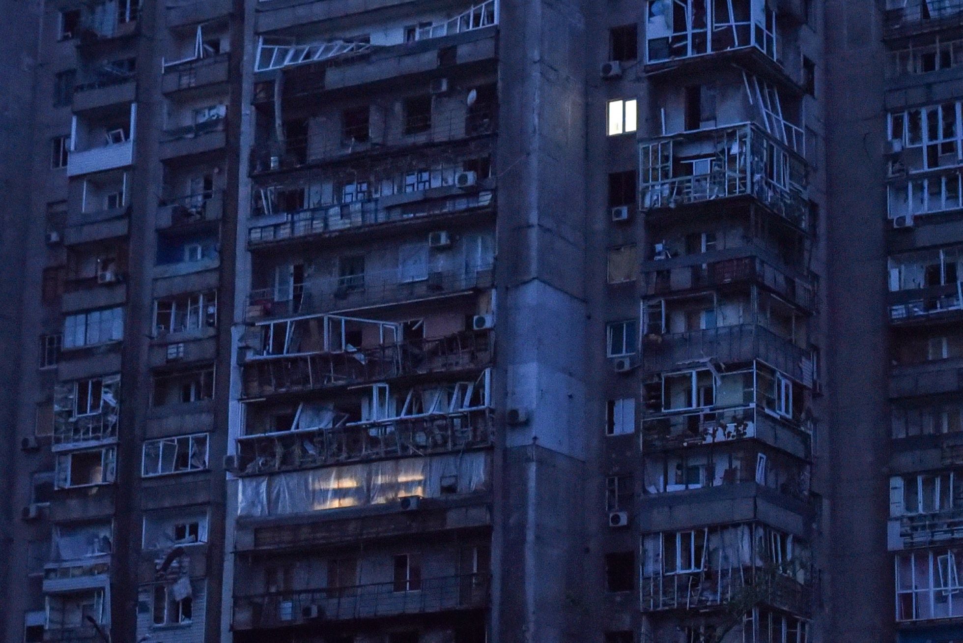 На фотографии — поврежденный многоэтажный дом в Мариуполе, в который через временный электрический кабель было подано энергоснабжение.
