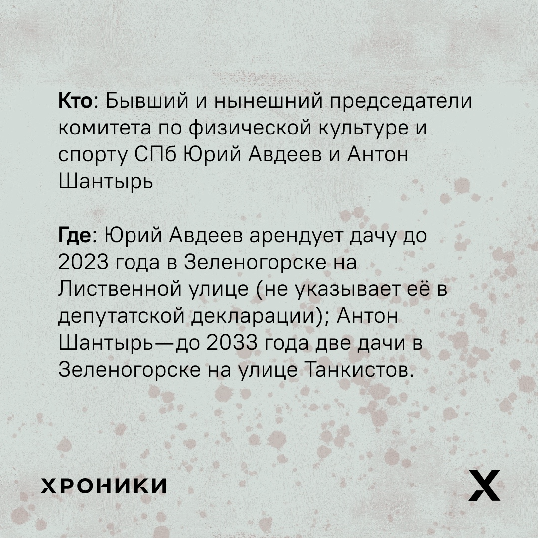 Среди таких арендаторов участков в Солнечном, Репино и Комарово можно встретить, например, экс-председателей петербургского Горизбиркома Александра Гнетова, Алексея Пучнина и Вадима Панкевича, точнее — его сыновей. Или половину членов Общественной палаты Петербурга — этим вообще непонятно за какие заслуги, учитывая принципиальную бесполезность их богадельни. Или культурных деятелей — директора ГМЗ «Петергоф» Елену Кальницкую, директора БКЗ «Октябрьский» Эмму Лавринович, директора БДТ им. Товстоногова Татьяну Архипову. Или председателей смольнинского спорткомитета Юрия Авдеева (бывшего) и Антона Шантыря (действующего). К слову, у Авдеева эта дача отсутствует в ежегодной депутатской декларации, а за такое в идеальном мире, как известно, лишают мандата.