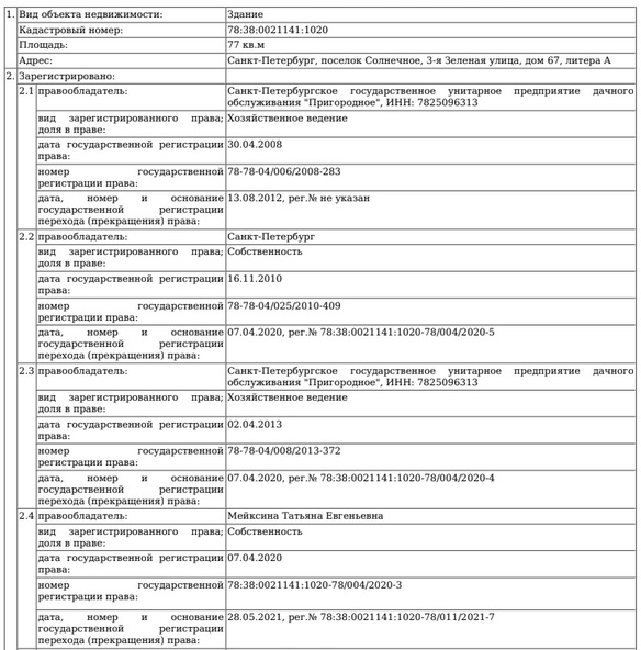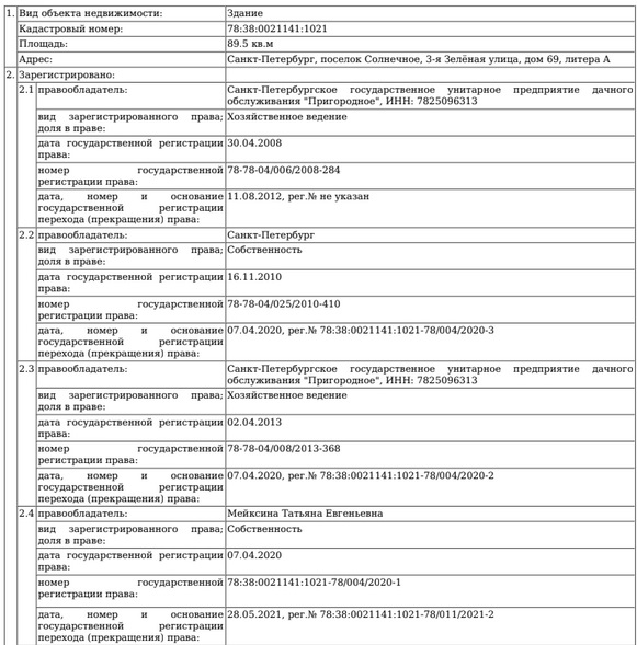Распоряжаются новые собственники землей по-разному — кто-то обживается, кто-то извлекает немалую прибыль. Возьмем, к примеру, супругу знаменитого «короля аренды», вице-губернатора Максима Мейксина Татьяну, которая в 2020 году выкупила в Солнечном две дачи за 7,47 млн рублей. Через четыре месяца она приватизировала участки под ними, а в 2021 году объединенный участок уже выставили на продажу за 41 млн рублей. Через несколько месяцев он нашёл новых владельцев.