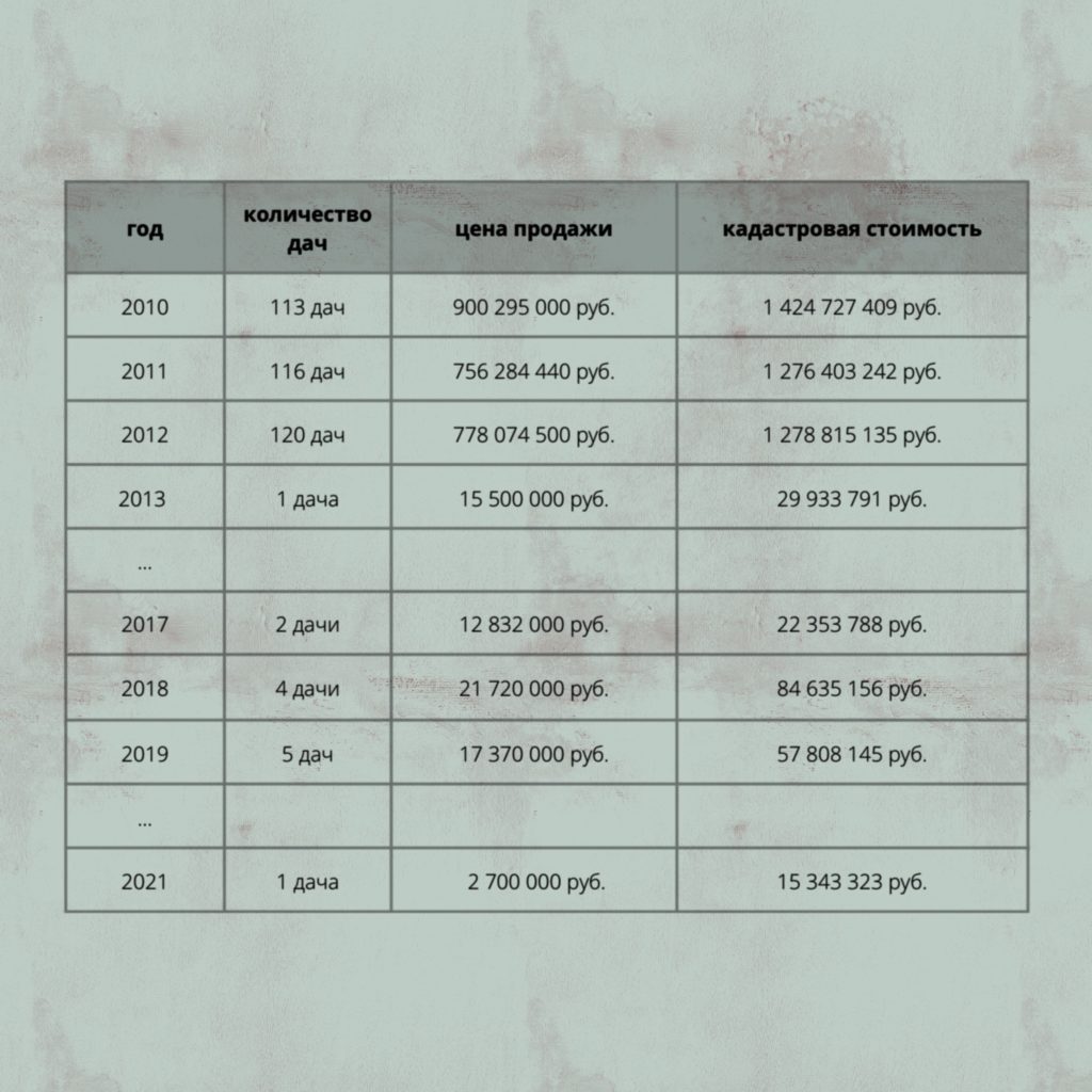 В те времена, когда городом руководили Валентина Матвиенко и Георгий Полтавченко, процесс поставили на широкую ногу. В 2010-2012 годах, например, по данным городского Фонда имущества, продали примерно 350 дач с земельными участками суммарной площадью около 60 га по средней цене примерно 400 тысяч рублей за сотку. Город получил за всё почти 2,5 млрд рублей, при том, что кадастровая стоимость этих земель, по данным Росреестра — около 4 млрд рублей. Кадастровая, не рыночная, то есть минимальная! Затем поток обмелел и стал исчисляться единицами продаж в год.