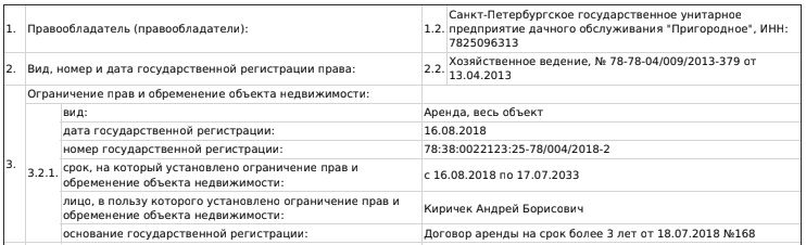 При этом постороннему человеку невозможно узнать, каким, собственно, образом можно получить такие шоколадные условия. «Новая газета» обращалась в Смольный, но о том, куда и к кому обращаться за долгосрочной арендой, ни в ГУП «Пригородное», ни в городской администрации не объяснили. Даже точные тарифы аренды заранее не вычислить — для расчётов применяются десятки коэффициентов, так что она может составлять как 120 тысяч, так и 1,2 млн рублей в год.