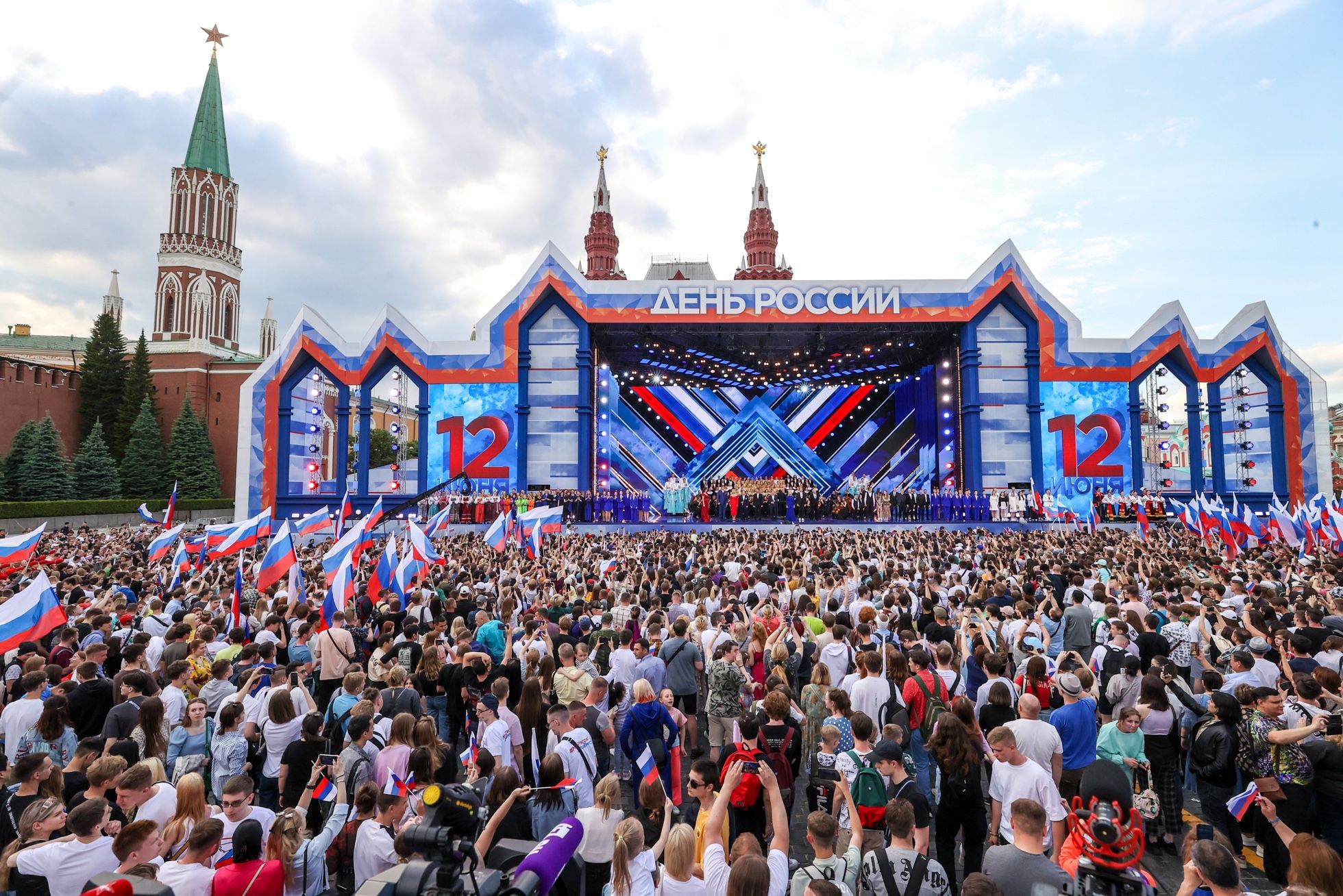 «Будем жить, с праздником России!» — кричит со сцены Ирина Аллегрова. «Ро-сси-я!» — скандирует толпа в ответ, размахивая триколорами.