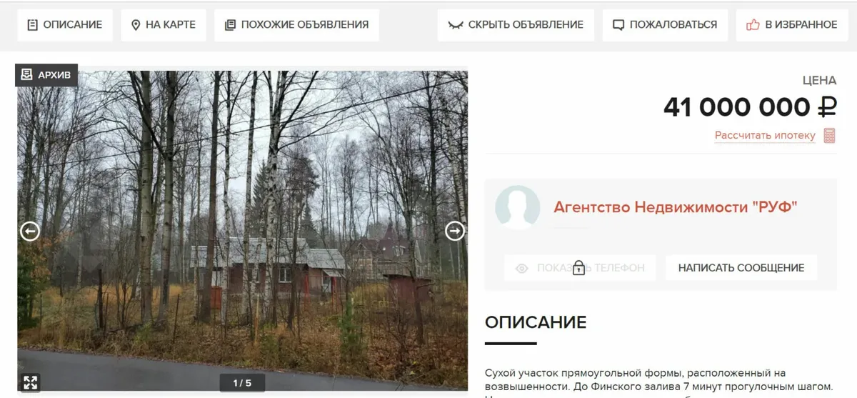 По какой цене супруга Мейксина продала участок с домиками, точно не известно. Но просила она за него 41 млн рублей — вот объявление о продаже того самого участка с теми самыми дачками.