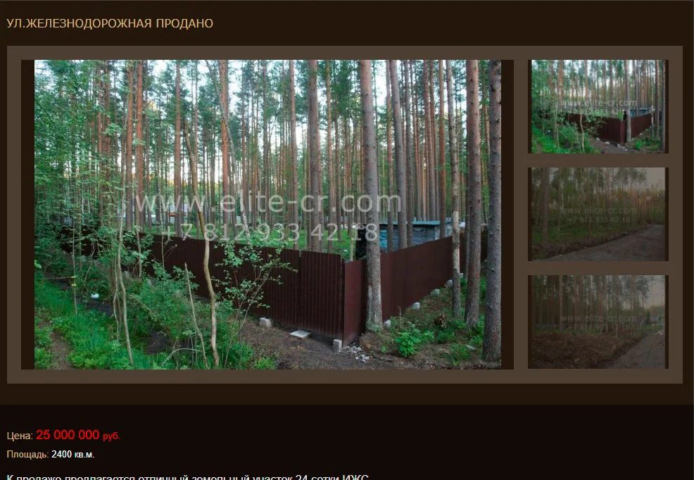 Например, вот участок на Железнодорожной улице в Солнечном. Приобретен за 10,4 млн рублей (документ имеется в распоряжении «Досье»), продан за 25 млн рублей, судя по фото, в том же состоянии.