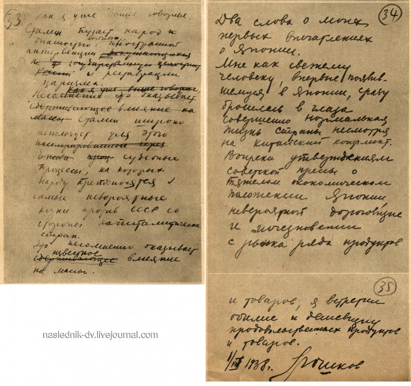"Сталин пугает народ опасностью иностранной интервенции и реставрации царизма. Сталин широко использует для этого судебные процессы, на которых народу преподносятся самые невероятные козни против СССР со стороны капиталистических стран. Это несомненно оказывает известное влияние на массы. Два слова о моих первых впечатлениях от Японии. Мне как свежему человеку, впервые появившемуся в Японии, сразу бросилась в глаза совершенно нормальная жизнь страны, несмотря на китайский конфликт. Вопреки утверждениям советской прессы о тяжелом экономическом положении Японии, невероятной дороговизне и исчезновении с рынка ряда продуктов и товаров, я встретил обилие и дешевизну продовольственных продуктов и товаров. 1 июля 1938 год".