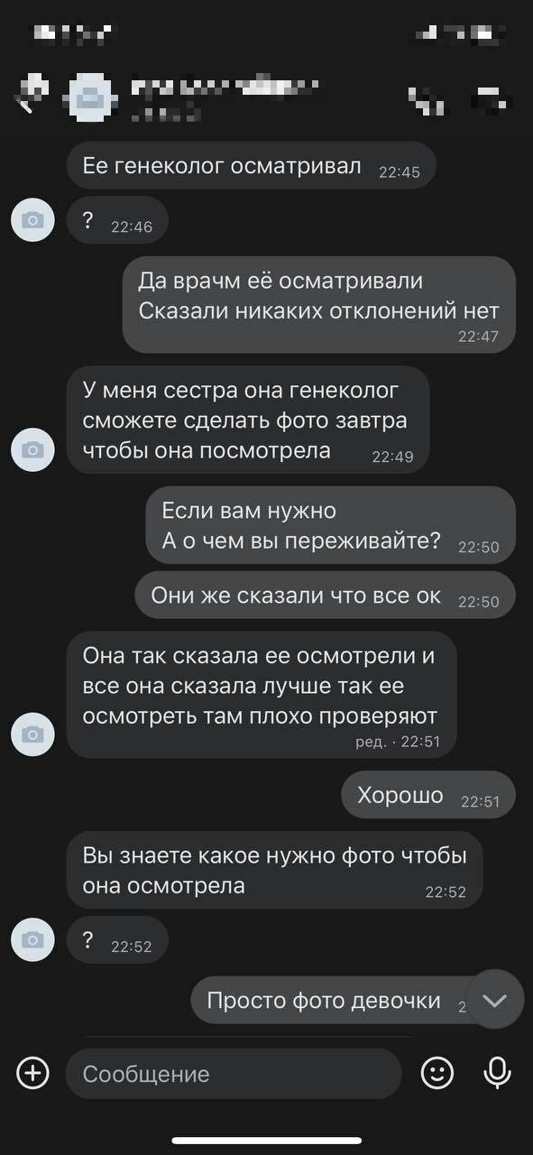 Волонтерам удалось выяснить, что это пишет мужчина. Он рассказывал сотруднице «Альтернативы», что передача ребенка будет оформлена через нотариуса. А позже сообщил, что в случае физических отклонений, «ребенок будет использован для инцеста». Также он делился своими планами по поводу лишения младенца девственности.«По ходу нашей переписки та самая Ирина просила отдать ребенка на персональное гинекологическое обследование или же прислать фото гениталий только рожденного ребенка. Все это объяснялось плохим уровнем подготовки мед. персонала, который работает в роддомах», – написали в волонтерской группе.