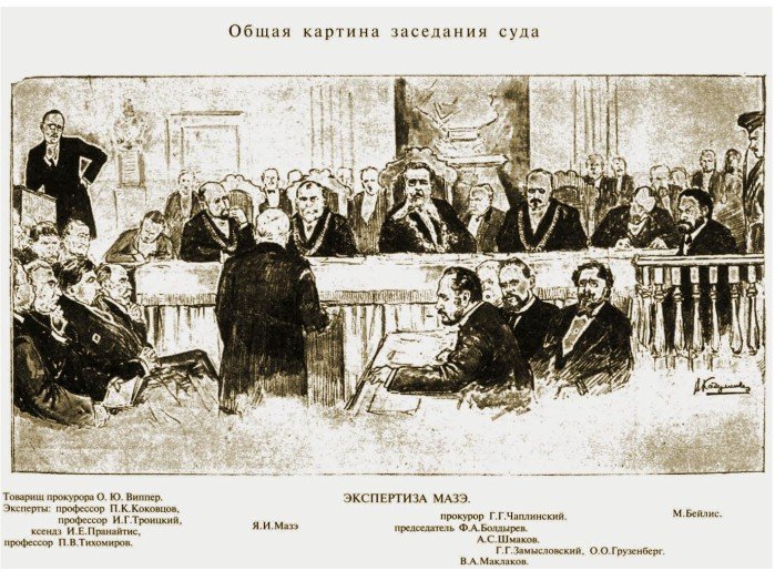 Суд над Бейлисом начался 25 сентября. Состав присяжных оказался для университетского города неслыханным: семеро (!) из них были крестьяне, двое мещан (рабочих), трое чиновников. За ними велся постоянный надзор тайной полиции.