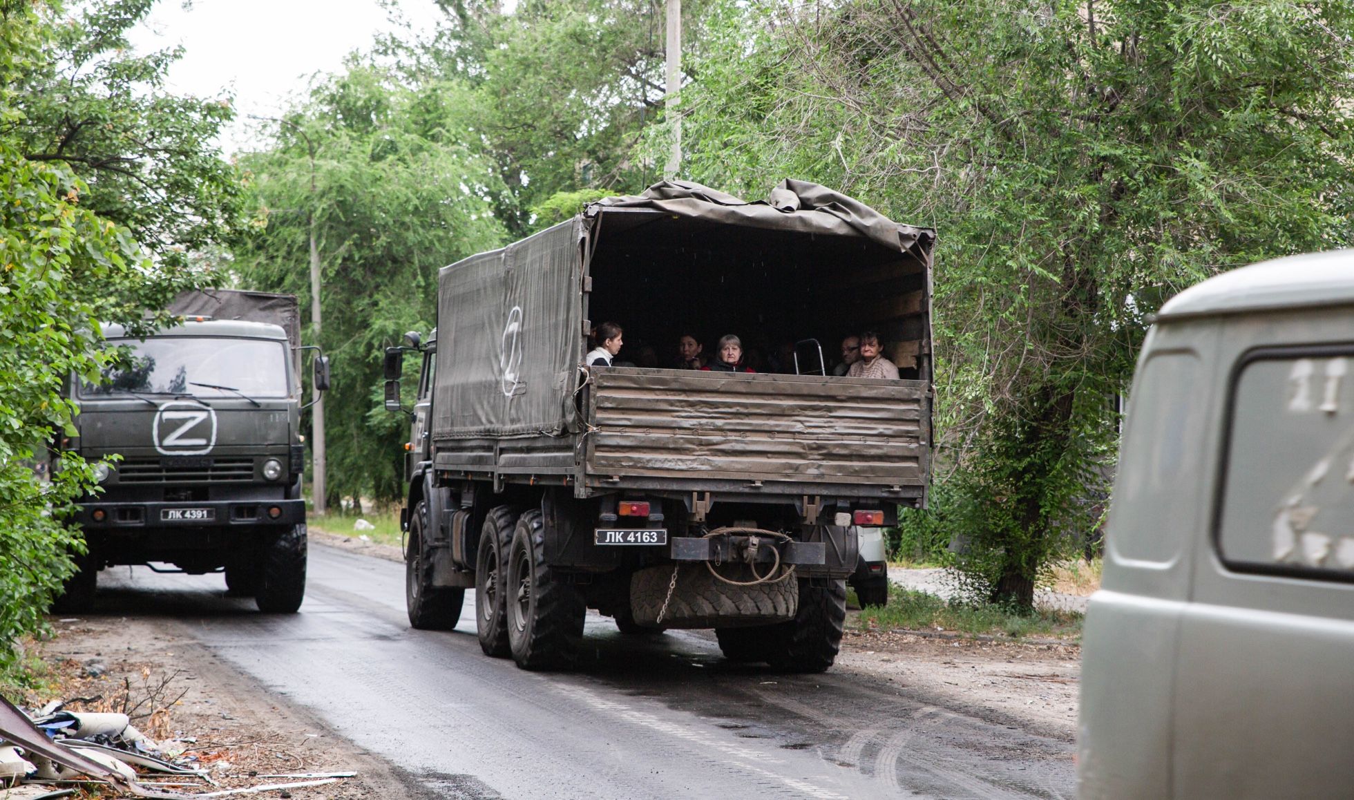 Российская армия продолжает бои в Луганской области за полный контроль над Северодонецком. На городском комбинате «Азот» остаются заблокированными военные ВСУ и сотни мирных жителей. Минобороны РФ обвинило украинскую сторону в срыве гуманитарной операции по вывозу мирных граждан с комбината. Судя по кадрам, опубликованным ТАСС 15 июня, эвакуация в Северодонецке все-таки ведется, но гражданских вывозят из города на машинах с военной маркировкой.