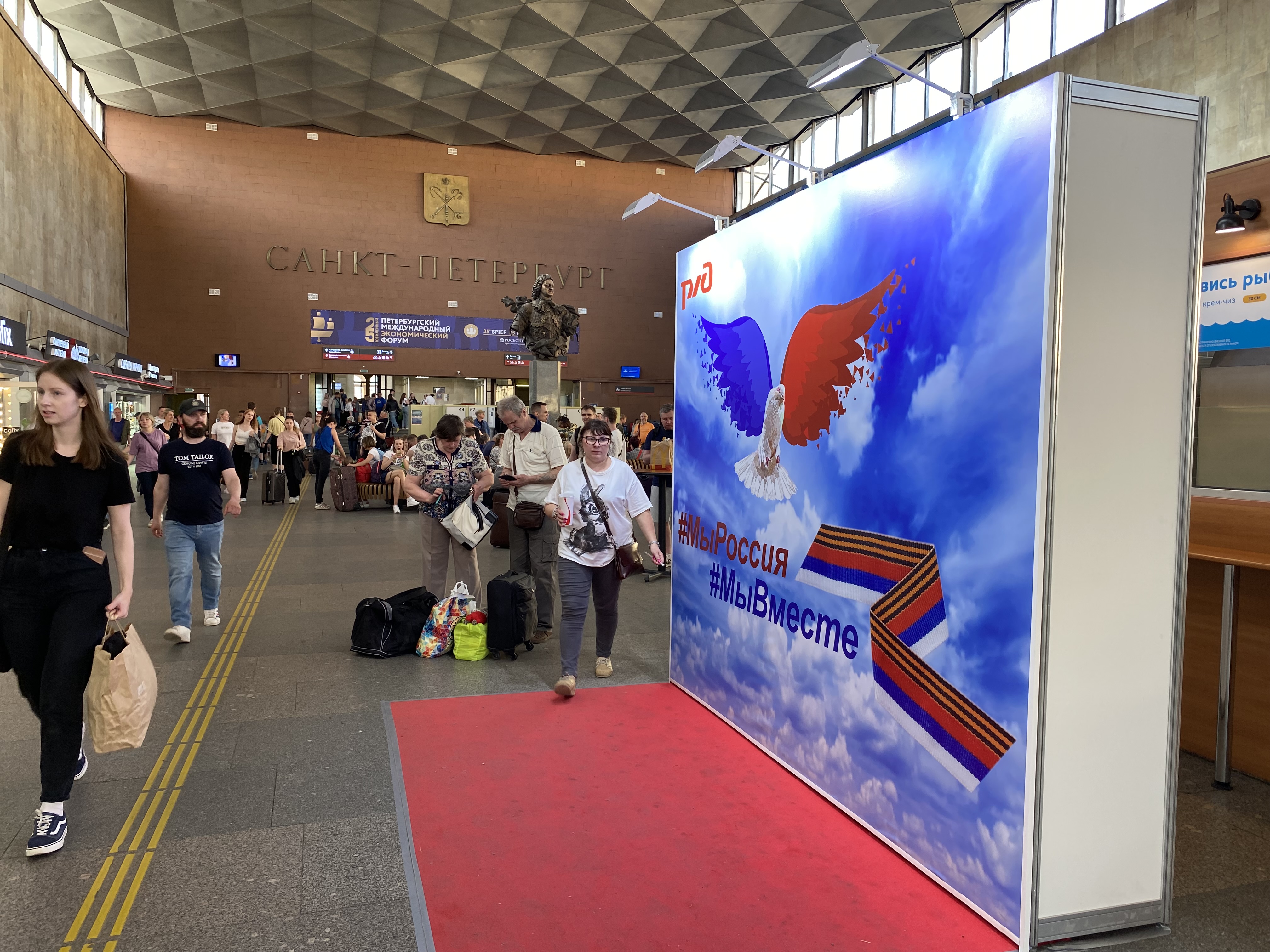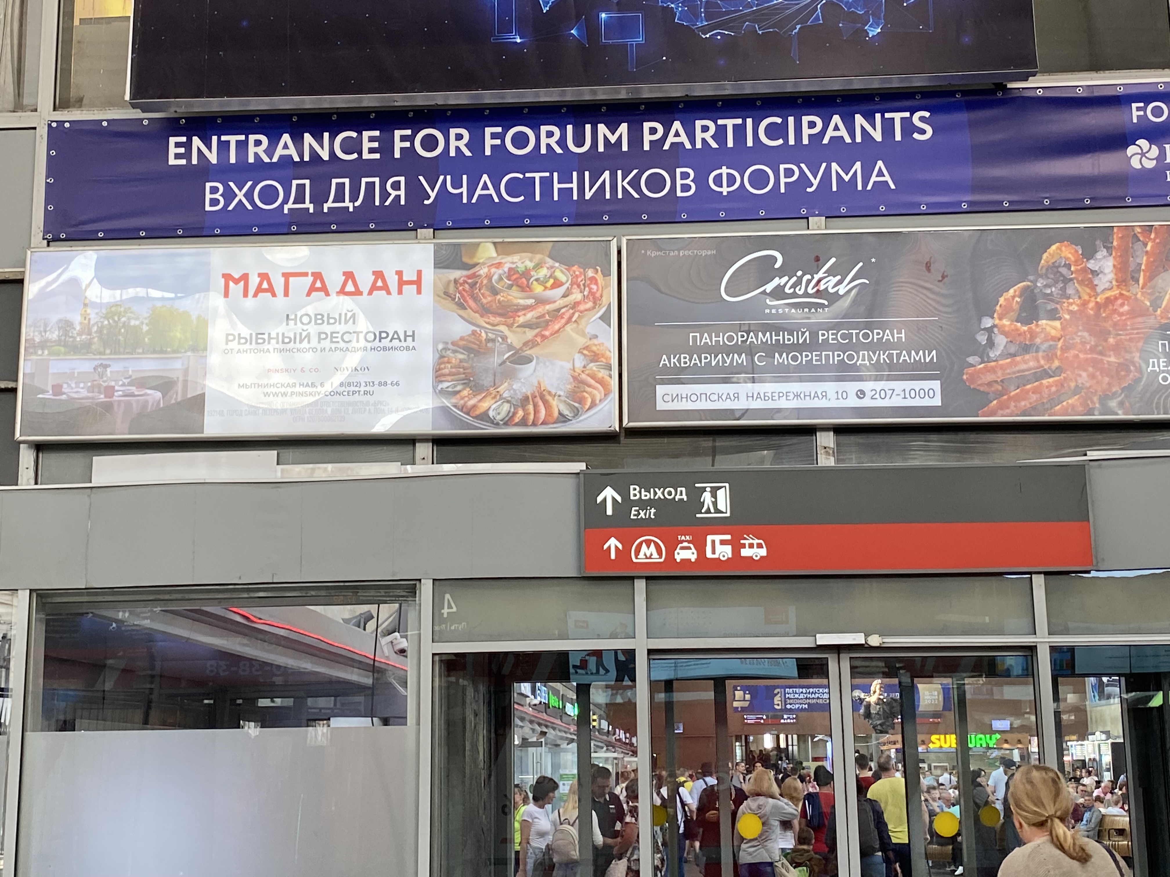 Для рядовых участников форума, прибывающих на Московский вокзал, в нескольких местах развешаны одинаковые рекламные растяжки со словами приветствия. Один из таких баннеров размещен рядом с рекламой рыбного ресторана "Магадан". Второй баннер с указателем – "вход" для участников форума – рядом с железнодорожным указателем "выход".