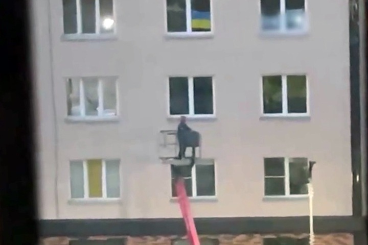 10:49 В Красноярске жители одного из многоквартирных домов по улице Линейная вывесили в своих окнах флаг Украины и протестный плакат. После этого неизвестные в касках и спецодежде пригнали автовышку и белой краской закрасили часть окон, передает НГС24.