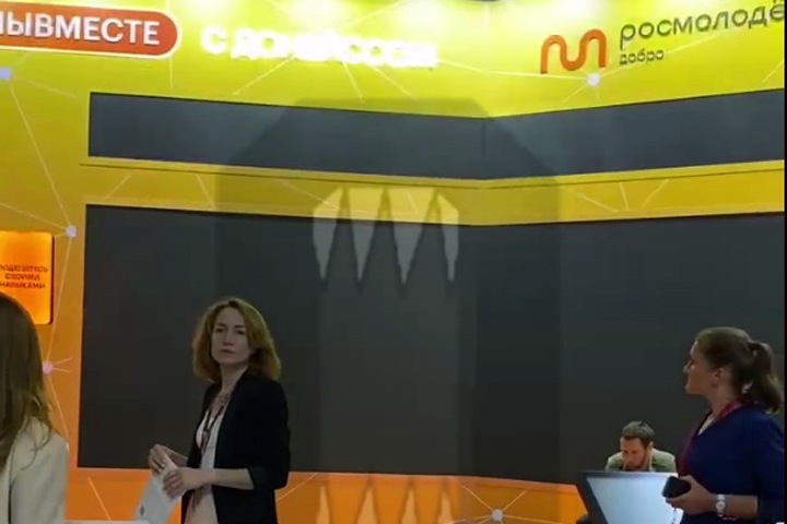 Организаторы форума просили журналистов перестать снимать погасший стенд с патриотическими лозунгами.