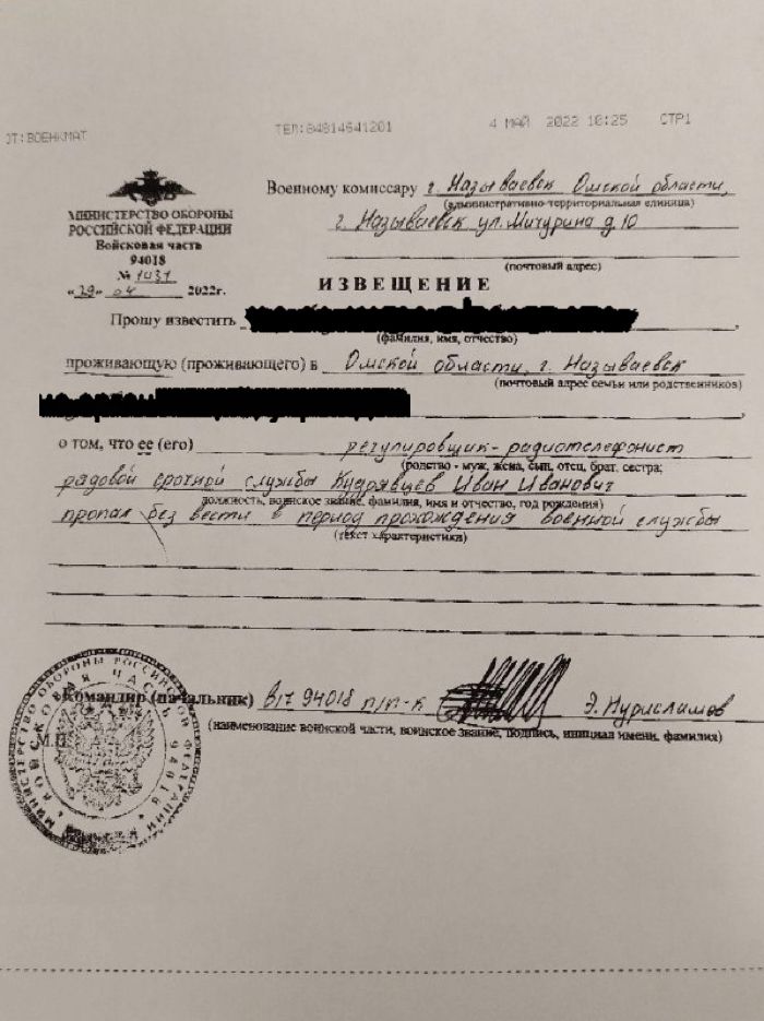 29 апреля министерство обороны направило военному комиссару Называевска извещение на имя Нины (есть в распоряжении «Медузы») о том, что «регулировщик-телефонист, рядовой срочной службы Кудрявцев Иван Иванович пропал без вести в период прохождения воинской службы».