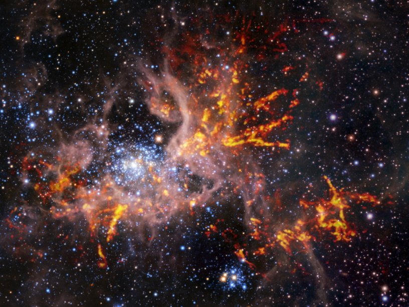 Новые наблюдения на Атакамской Большой миллиметровой/субмиллиметровой антенной решетке (ALMA) помогли астрономам выявить тонкие структурные детали в области звездообразования 30 Золотой Рыбы, известной как Туманность Тарантул. На полученном с высоким разрешением изображении, опубликованном сегодня Европейской Южной обсерваторией (ESO) и включающем в себя данные наблюдений на ALMA, туманность предстает в новом свете: волокнистые газовые облака позволяют увидеть, как массивные звезды определяют очертания этой области.