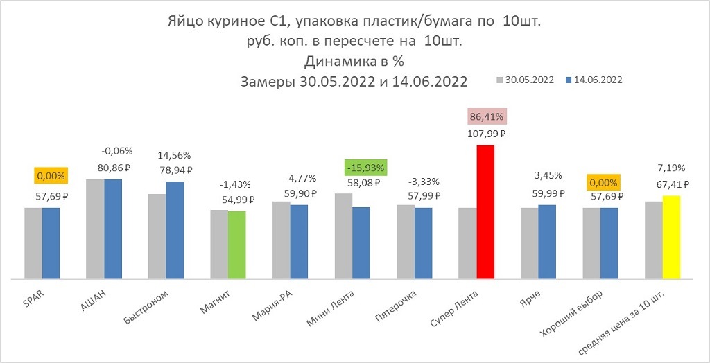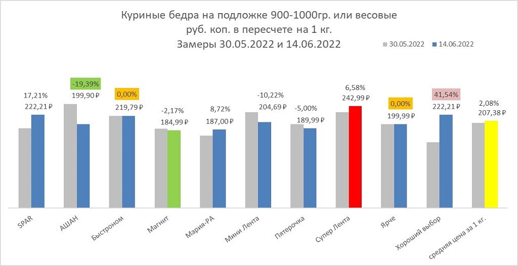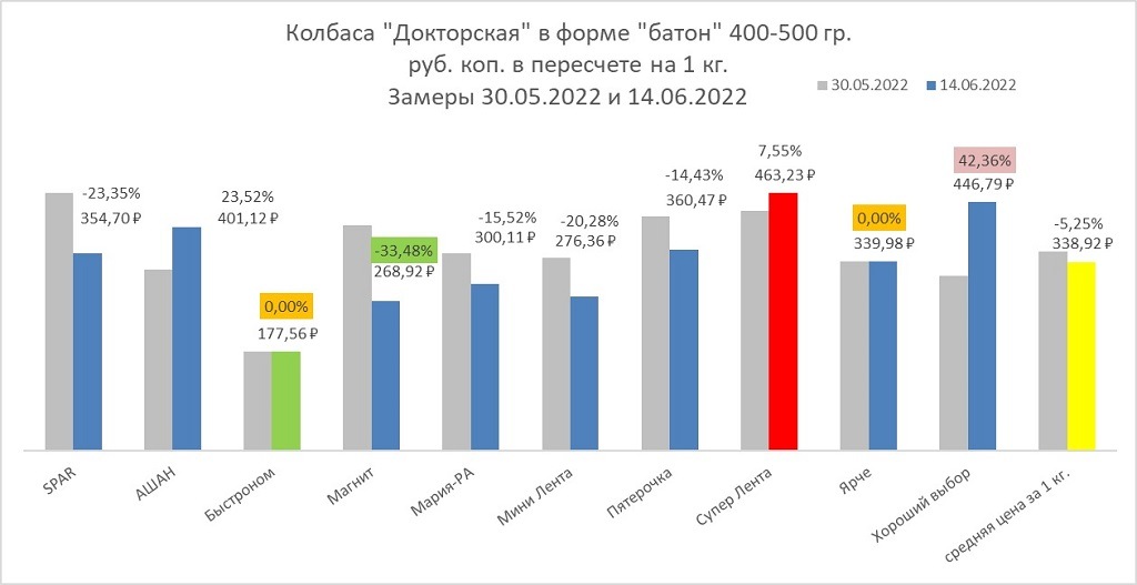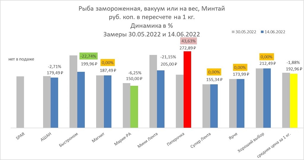 Цены фиксируют в сетях Spar, «Ашан», «Быстроном», «Магнит», «Мария-Ра», «Мини Лента», «Пятерочка», «Супер Лента», «Ярче» и «Хороший выбор». Принцип выбора товара — самая низкая стоимость. Сравнивать будем цены за 30 мая и 14 июня.