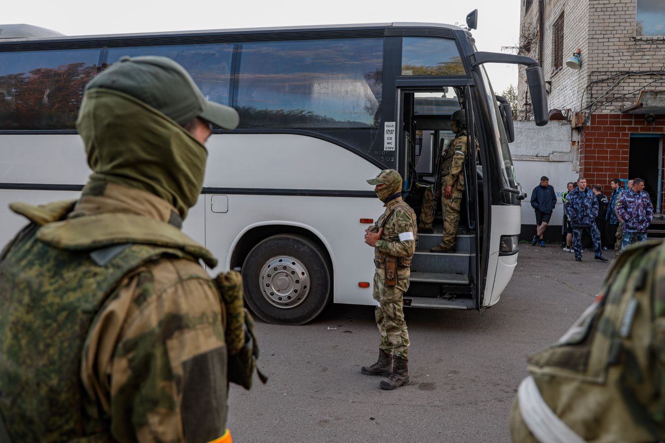 Alessandro Guerra / EPA / Scanpix / LETA Российские военные и бойцы самопровозглашенной ДНР у автобуса, на котором вывозят пленных защитников «Азовстали». Мариуполь, 17 мая 2022 года