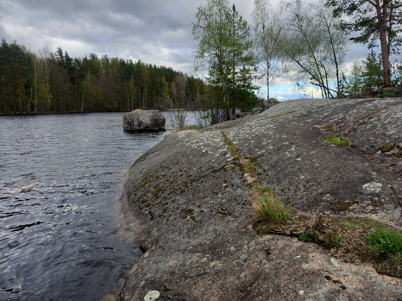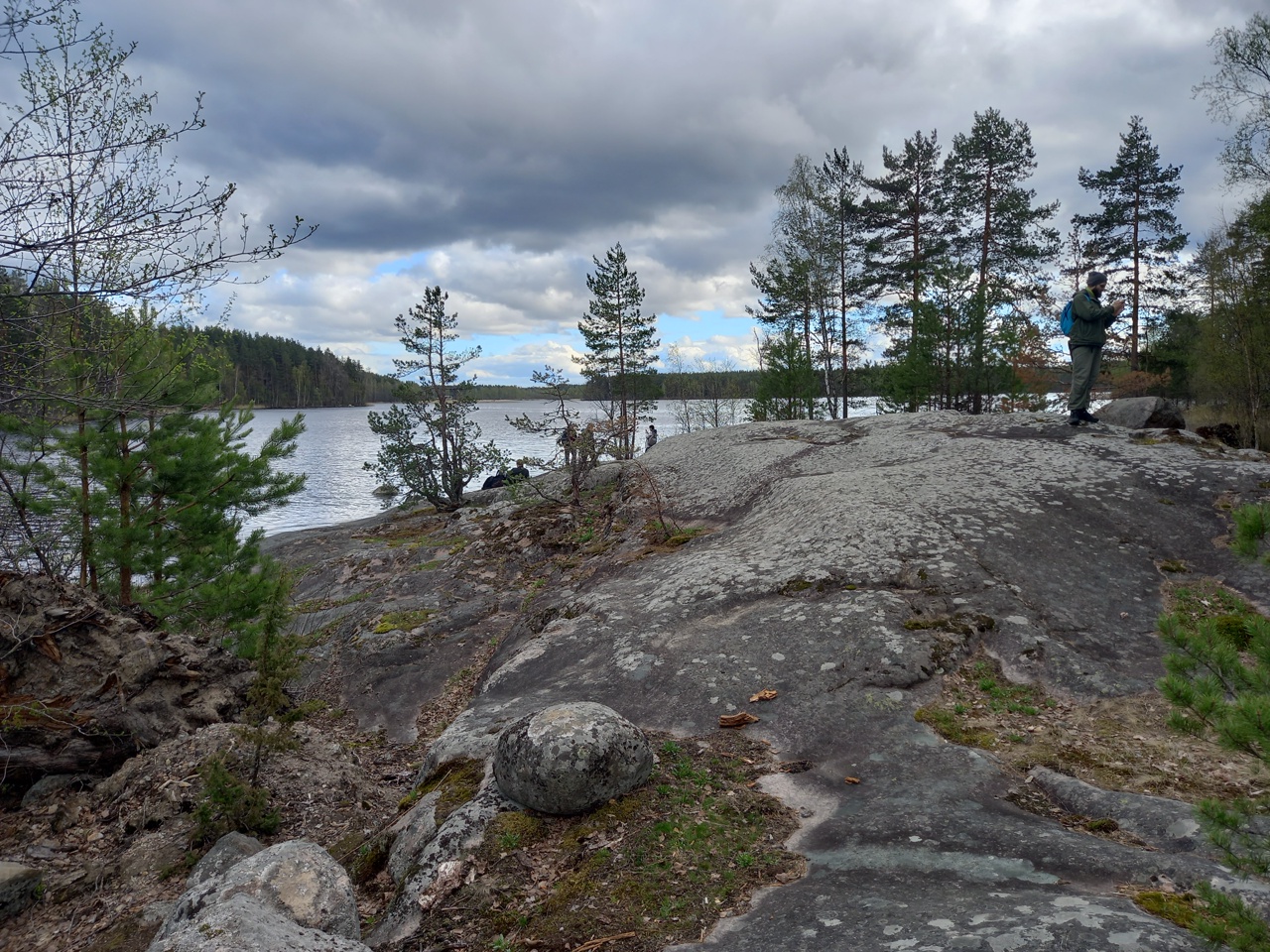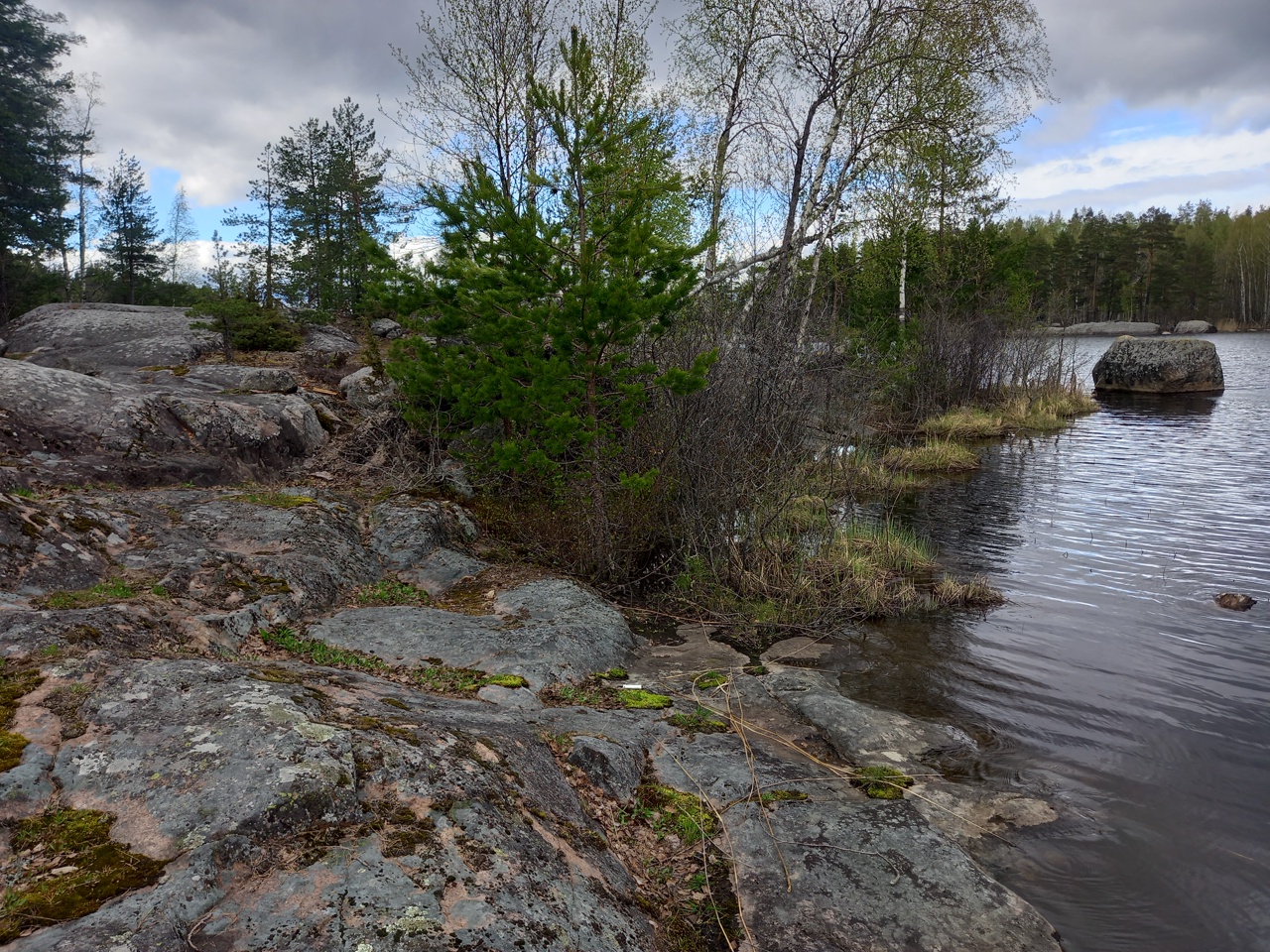 Камни напротив городища. Здесь на берегу есть рыбацкая стоянка. Там мы сделали привал, прежде чем двинуться в обратный путь. Нам предстояло еще многое в этот день увидеть, поэтому нужно было отдохнуть. Кстати, рыбаков тут много. Вуокса богата рыбой.