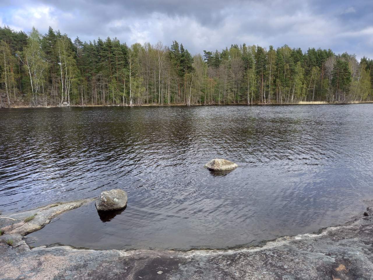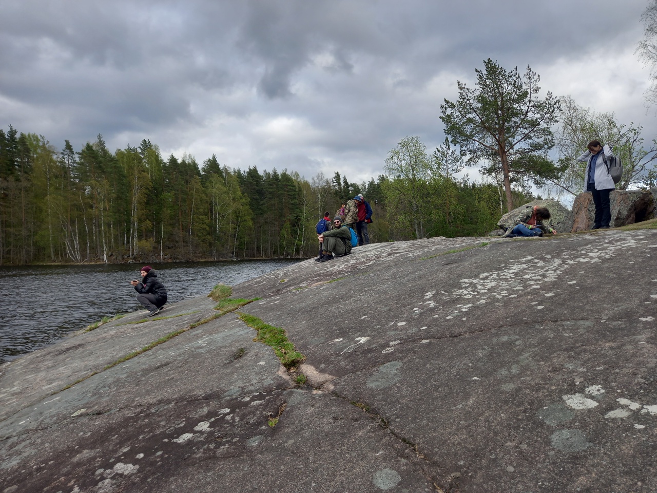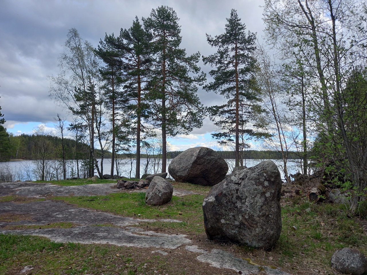 Камни напротив городища. Здесь на берегу есть рыбацкая стоянка. Там мы сделали привал, прежде чем двинуться в обратный путь. Нам предстояло еще многое в этот день увидеть, поэтому нужно было отдохнуть. Кстати, рыбаков тут много. Вуокса богата рыбой.