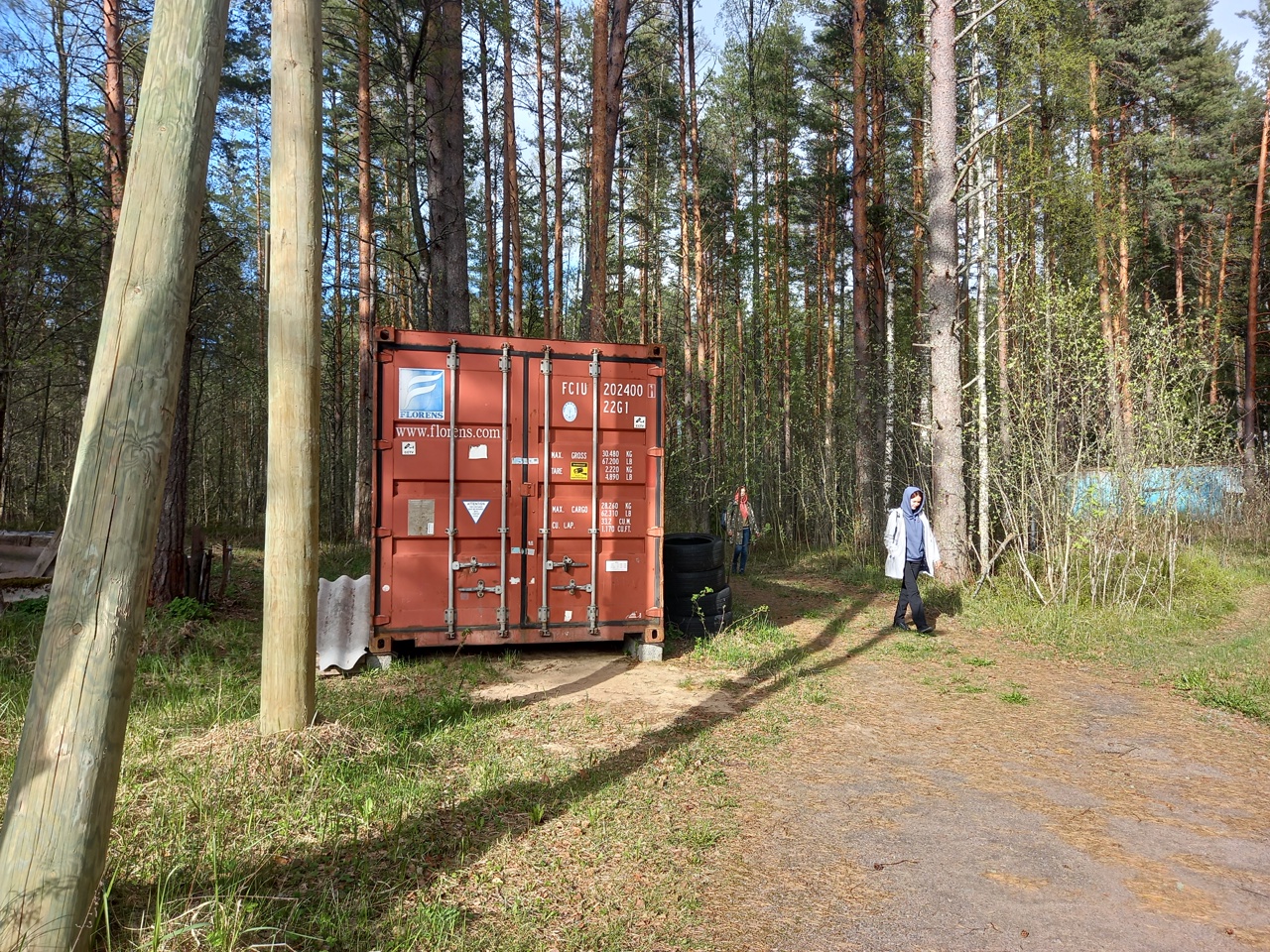 Выходим из леса в поселок. Если надумаете повторить наш путь сюда, то заходить в лес надо вот возле этого контейнера. А дальше по направлению к воде тропы нет.