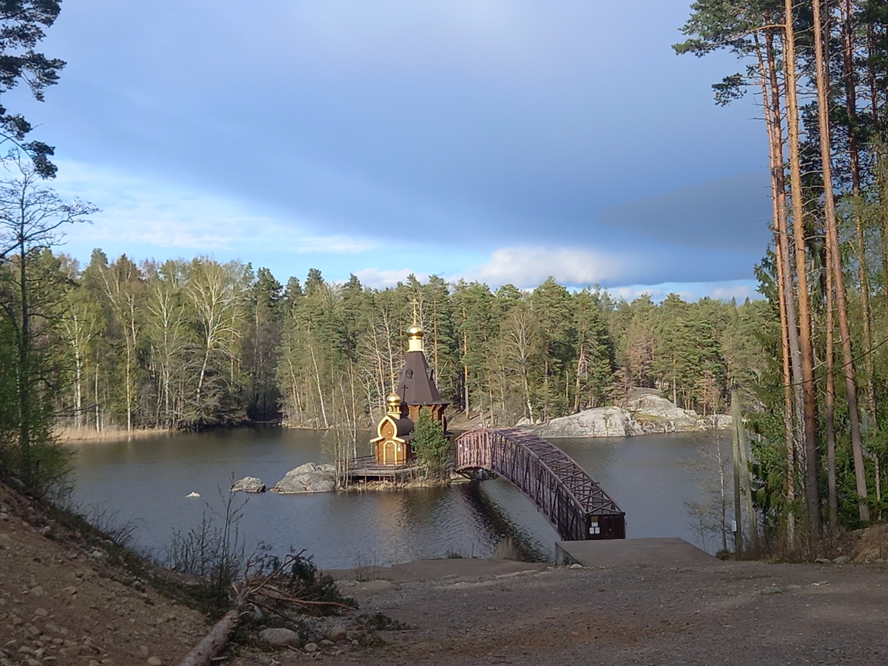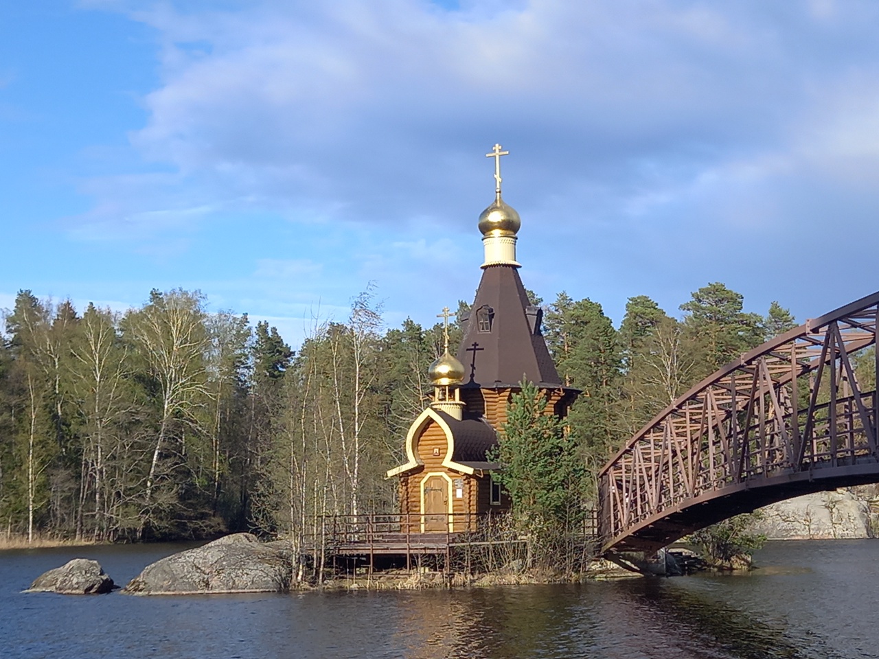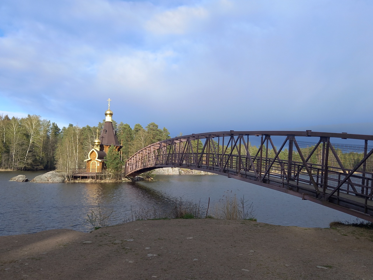 Подходим к последней достопримечательности на нашем маршруте - церкви Андрея Первозванного на Вуоксе. Место, которое популярно у туристов и паломников. Днем она открыта. Но мы не стали днем заходить, потому что там была огромная толпа туристов, приехавших на двух автобусах, и как там было разместиться на острове, было непонятно. А после 17:00 вход на мост закрывают замком.