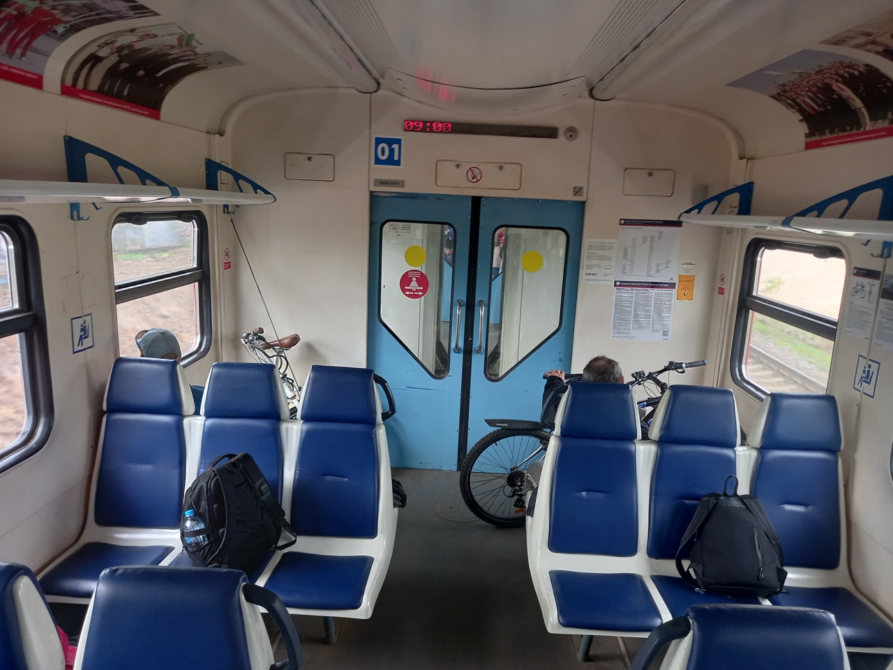 В кадр попало очередное велобыдло, которое - в нарушение правил перевозки велосипедов - затащило свой вел в узкий салон демиховской электрички, а потом выставило грязное колесо в проход, пачкая проходящих пассажиров. Примечательно, что другой велосипедист слева никого не пачкает. Попытки разговаривать с таким велобыдлом обычно бесполезны: они устраивают истерику и визжат бессмысленный набор слов. При этом снять переднее колесо (или хотя бы накрыть его чехлом, чтобы никого не пачкать), что занимает всего пять минут, им и в голову не приходит, они предпочтут полчаса скандалить, а потом еще многие часы истерить в интернете, отстаивая свое "право" на хамство.