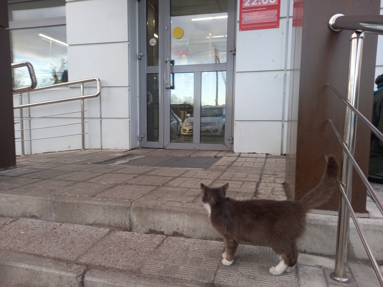 Рядом магазин, где мы купили себе мороженого. У входа дежурила местная кошка. Одна из наших путешественниц дала ей колбасы. Когда я был здесь в следующий раз, кошка снова здесь была. Так что запасайтесь колбасой на этом маршруте.