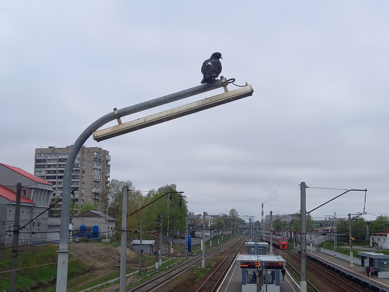 На фото - станция Пискаревка в Петербурге, где я сажусь на электричку до Приозерска. На фонаре сидит крылатый работник станции, следит сверху за порядком.