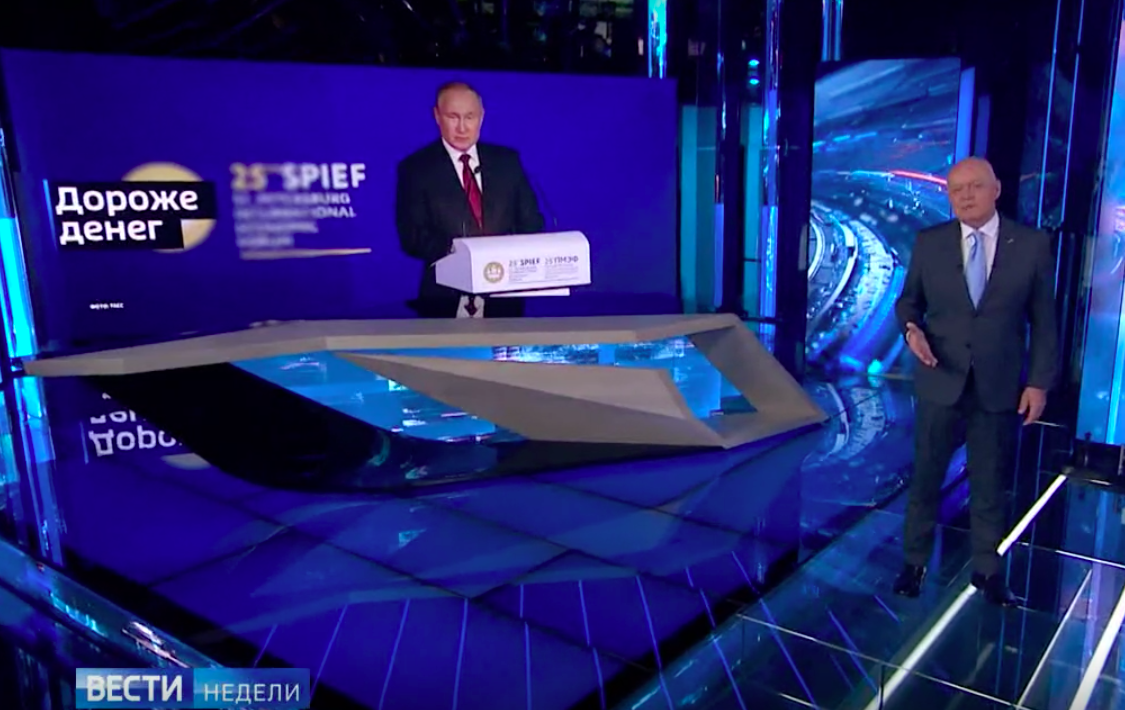 Главная тема на всех каналах — Петербургский экономический форум. По мнению ведущей итоговой программы НТВ Ирады Зейналовой, он стал «разговором со всеми континентами о новом мировом порядке вещей, о котором The New York Times пишет как о „большой головной боли“ Америки». В изложении Зейналовой в цитируемой статье газеты написано: «Мы теряем лидерство, Запад не способен повлиять на тех, кто его не слушает. Они будут договариваться через БРИКС. Это начало большого обвала системы». На самом деле, статья немного о другом, тема обозначена в заголовке издания: «Байден стремится расширить коалицию против России, но встречает сопротивление». Позднее Зейналова еще несколько раз цитирует иностранные издания и каждый раз вольно трактует смысл заметок. В сюжетах о форуме на «России 1» и «Первом канале» показывается одна и та же группа иностранцев, один из них отказывается разговаривать с журналистами. Каналы подают это как свидетельство того, что иностранцы скрытно присутствовали на ПМЭФ. «Россия 1» рассказала, что на форуме назвали сроки появления российских электромобилей, а «Первый канал» даже показал один из прототипов. Это машина на базе пикапа УАЗ.