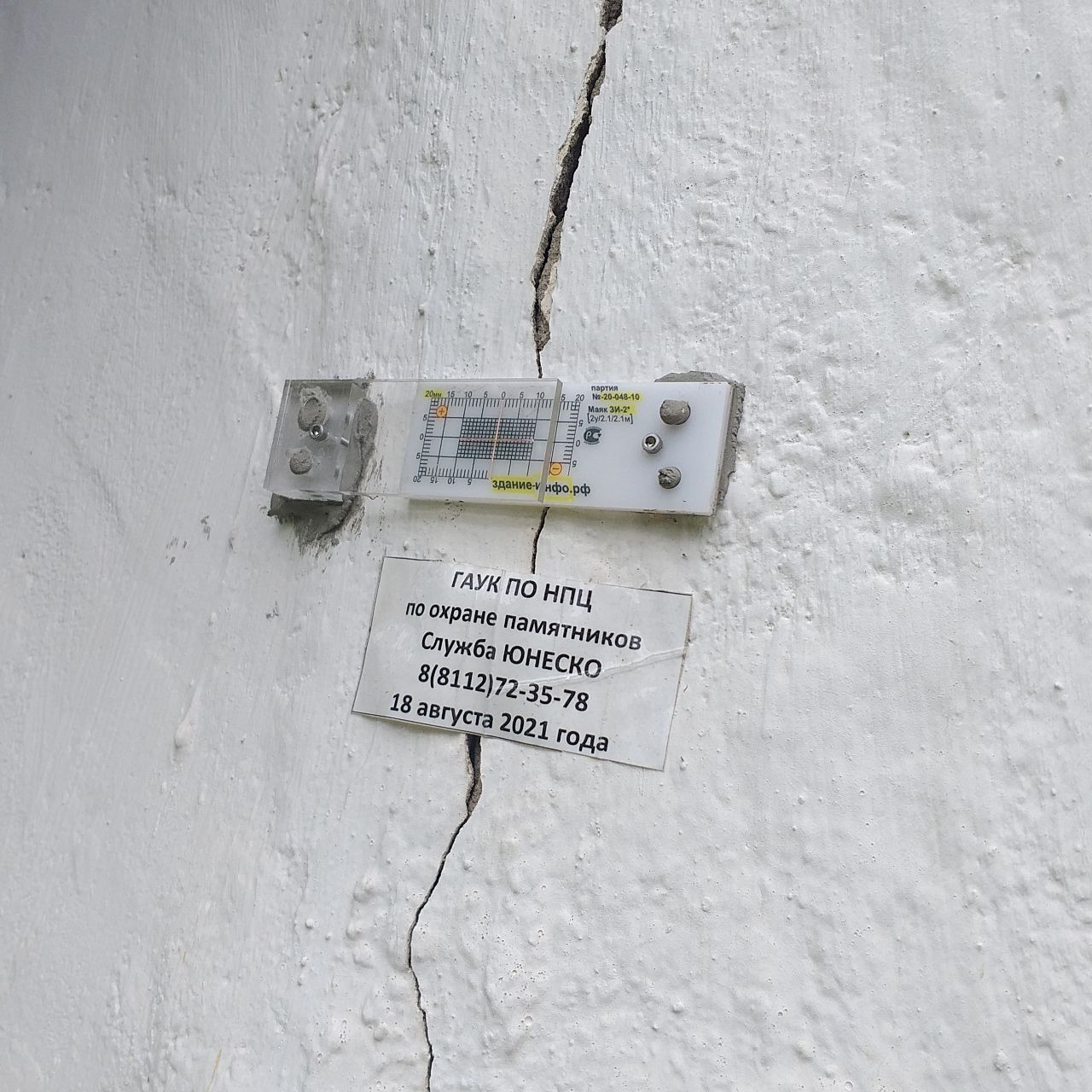 На месте соединения двух объёмов установлены маяки, которые фиксируют движение трещины.
