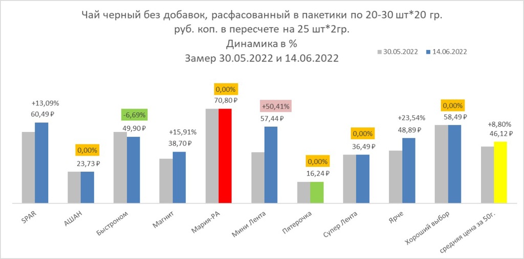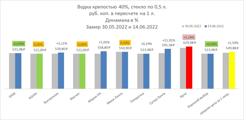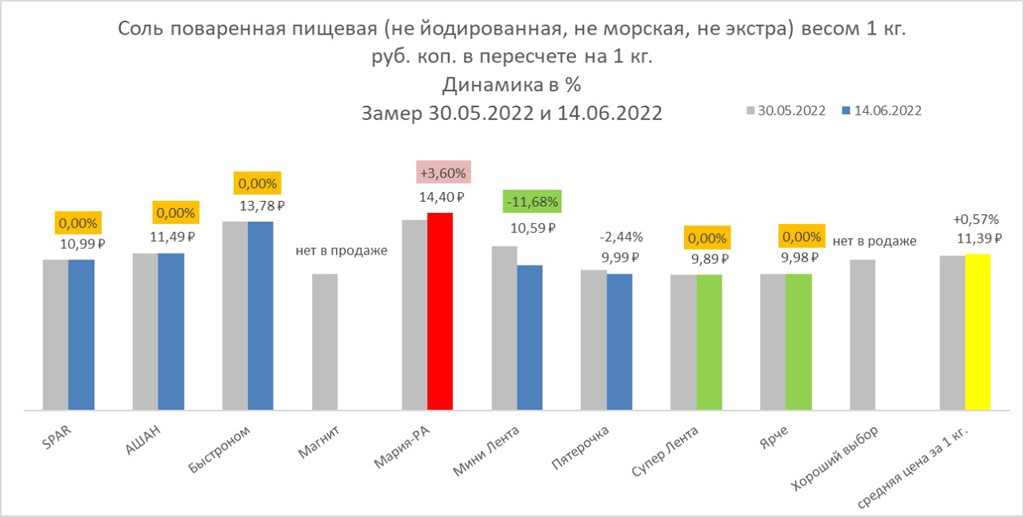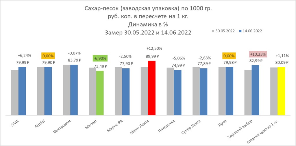Мониторинг проводился в 20 торговых точках во всех районах города. Сравниваем цены за 30 мая и 14 июня.