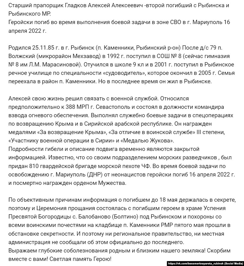 В некрологе Гладкова сообщается, что погиб он еще в середине апреля. Его земляки из города Рыбинск долго сохранять тайну оказались не в силах и в июне рассказали о секретных похоронах в сети ВКонтакте в группе «Бессмертная рота Рыбинск».