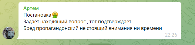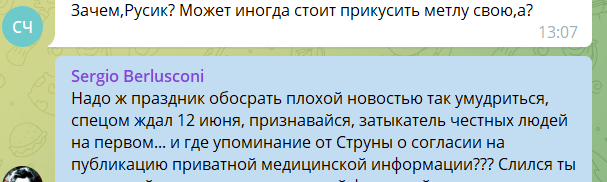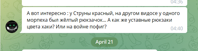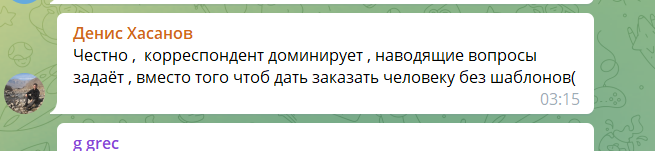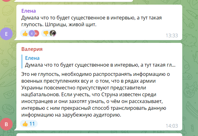Морпех объясняет, что «Струна» – это его штатный ротный позывной. Интервьюер хотел получить ответ о том, что в каждом подразделении украинцев в Мариуполе были представители «Азова», что тот видел косвенные признаки использования наркотиков и так далее. Интервью и поведение интервьюера возмутили даже ряд российских пользователей телеграм-канала.