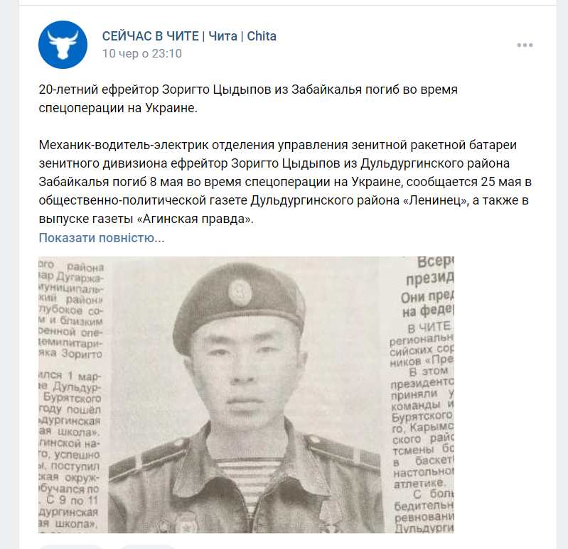 Механик зенитного дивизиона бригады Зоригто Цыдыпов из Забайкалья погиб 8 мая. Публикации об этом появились ближе к середине июня.