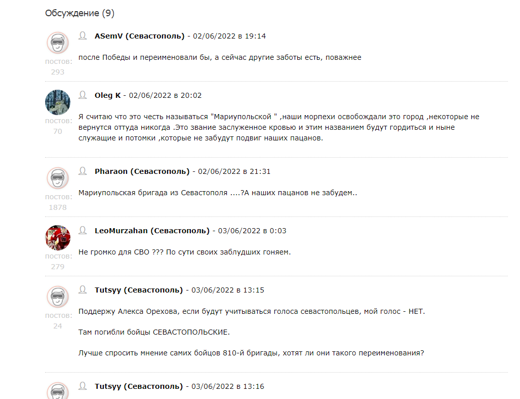 В севастопольских пабликах обсуждают идею Минобороны России о присвоении 810-ой бригаде почетного наименования «Мариупольская». На севастопольских ресурсах и группах ВКонтакте ряд севастопольцев высказывает недовольство.