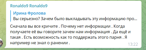 «Так уж получилось, что я был в тот день там. Уже через три часа после происшествия очень важные и хорошие люди сказали, что все обеспечат для «Струны» и «Рокота». Все, вопрос закрыт. В Москве все готово для реабилитации. Родственники будут обеспечены проживанием на период реабилитации. Укронацики за «Струной» охоту начинали. Чтобы не радовать врага, все держали язык за зубами, никто не пиарился «осведомленностью», а тихо и просто обеспечил лучшее протезирование и восстановление воинам. Какая оперативная и стратегическая задача решена этим постом? Хохлов порадовали, они довольны», – написал Филатов в своем телеграм-канале.