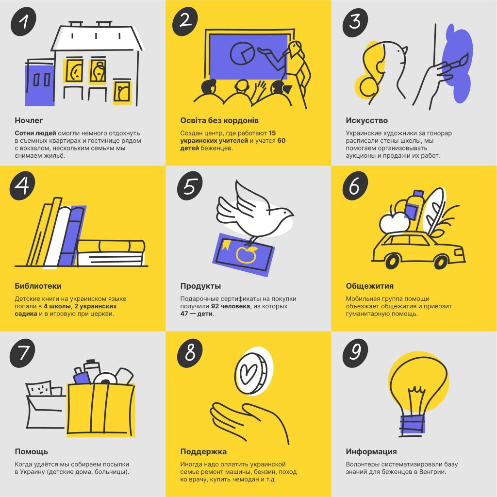 Я так истерично рисую эту мрачную картину, что может показаться, что у нас вообще ничего нет. Это не так. Есть волонтеры — обычные люди, непрофессиональные благотворители, которые обрабатывают сообщения в фейсбук-группах и стараются поднять на уши свои сообщества. Есть небольшие венгерские НКО, которые тянут на себе то, что удается тянуть. Но они ставят очень маленькие цели. Например, устроить в школу только 30 детей. Или помочь деньгами сотне человек. Или расселить 200 человек. Будапештский цирк поселил и трудоустроил сотню людей. Музыканты стараются помочь украинским музыкантам. Некоторые школы и организации дают свои помещения под классы, которые украинские учителя организуют. Если есть что-то поддерживающие в эти темные времена — это вот такое взаимодействие: вне политики, вне бюрократии.
