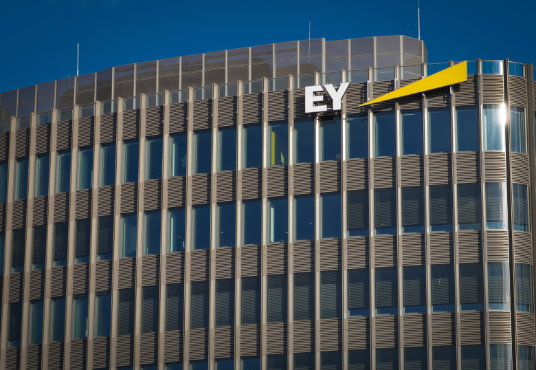 Логотип аудиторско-консалтинговой фирмы Ernst & Young (EY) на верхнем этаже высотного здания в районе Шпреедрайек на Фридрихштрассе, Берлин