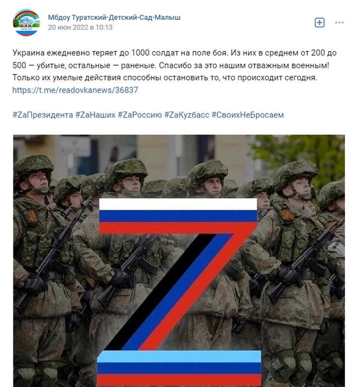 В сообществе детского сад «Малыш» поселка Турат во «ВКонтакте» публикуют официальные сводки Минобороны и сообщения провластных СМИ. Сообщество также постит Z-символику и фотографии маленьких детей с этими символами «спецоперации».