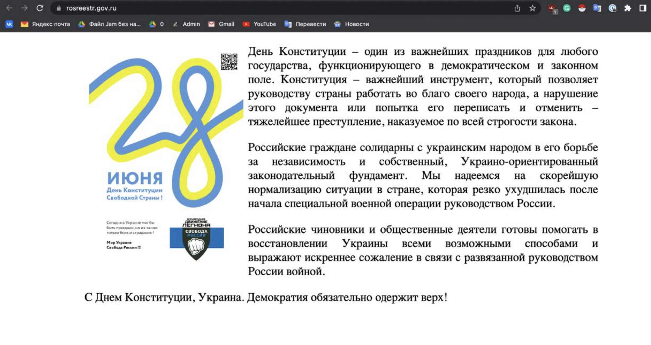Cайт Росреестра перестал открываться; там появилась заглушка про День Конституции Украины и извинения за развязанную войну